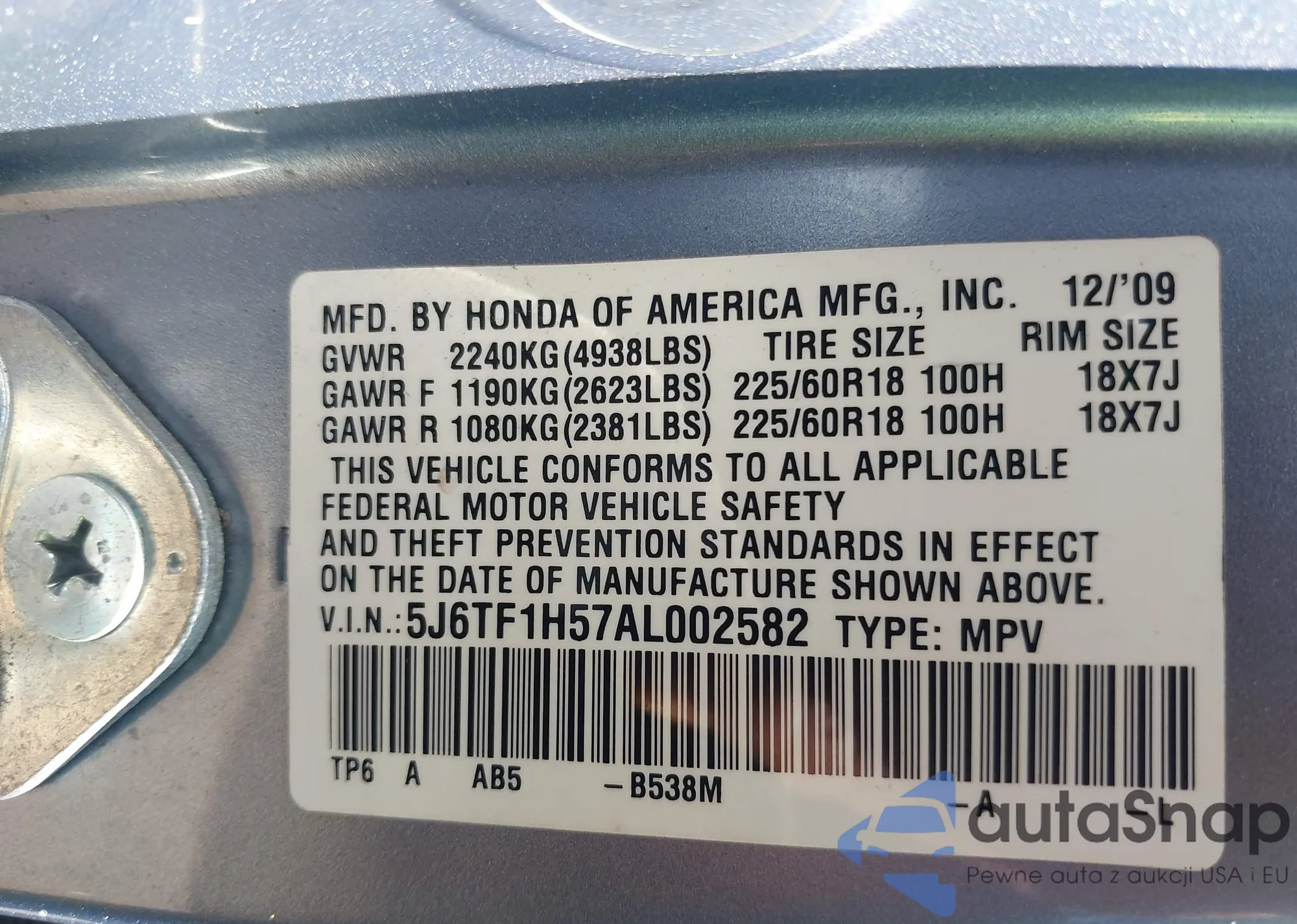 • VIN 5J6TF1H57AL002582