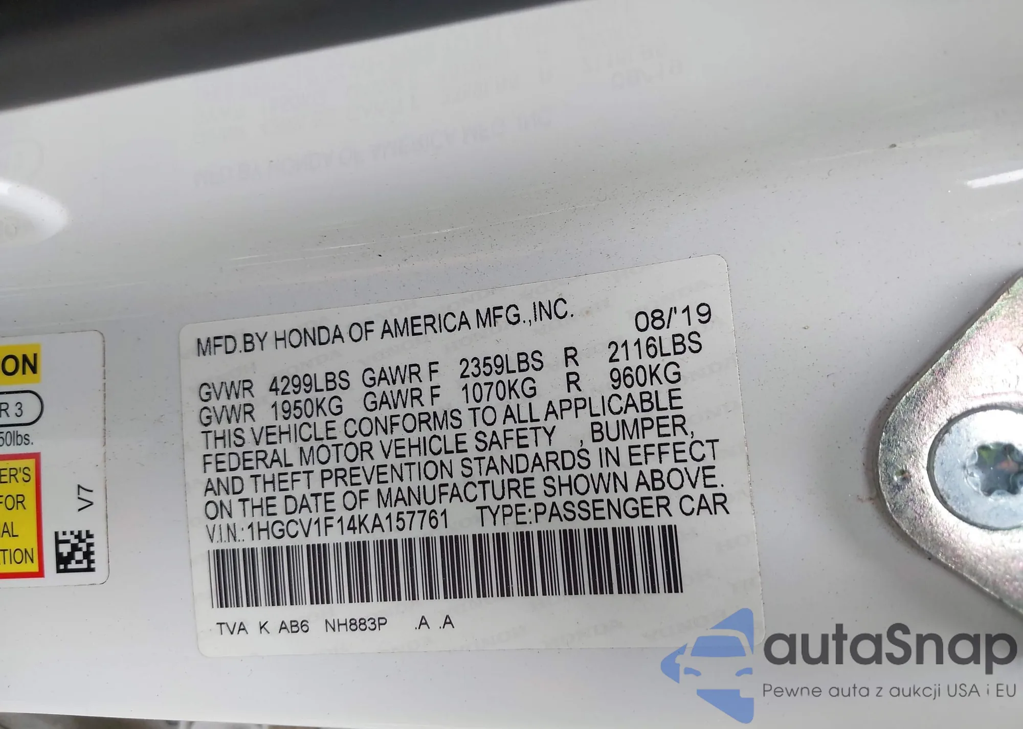 LOT: 42134796 VIN: 1HGCV1F14KA157761