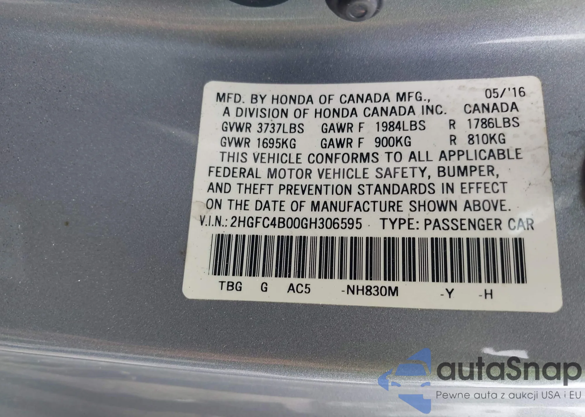 • VIN 2HGFC4B00GH306595