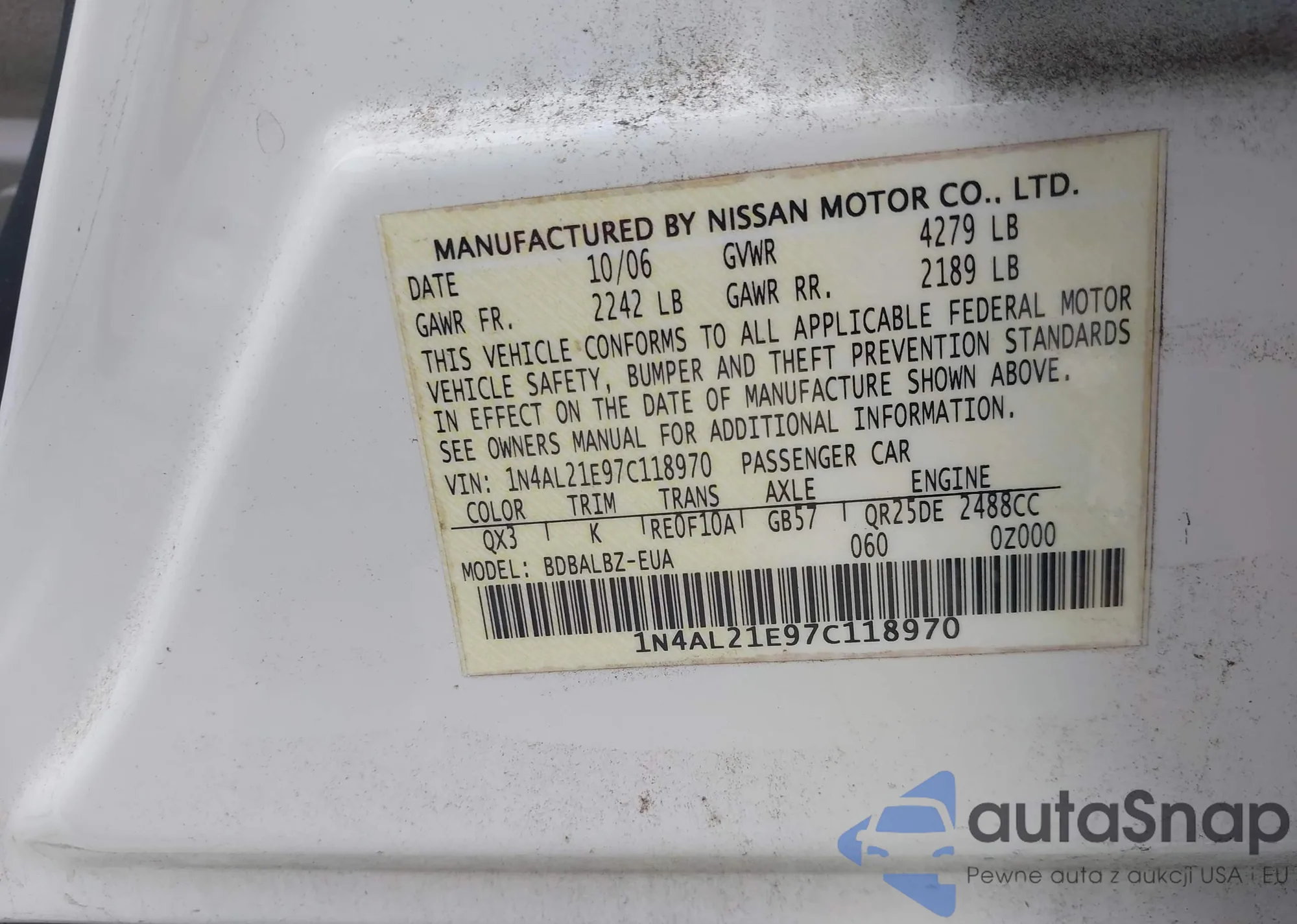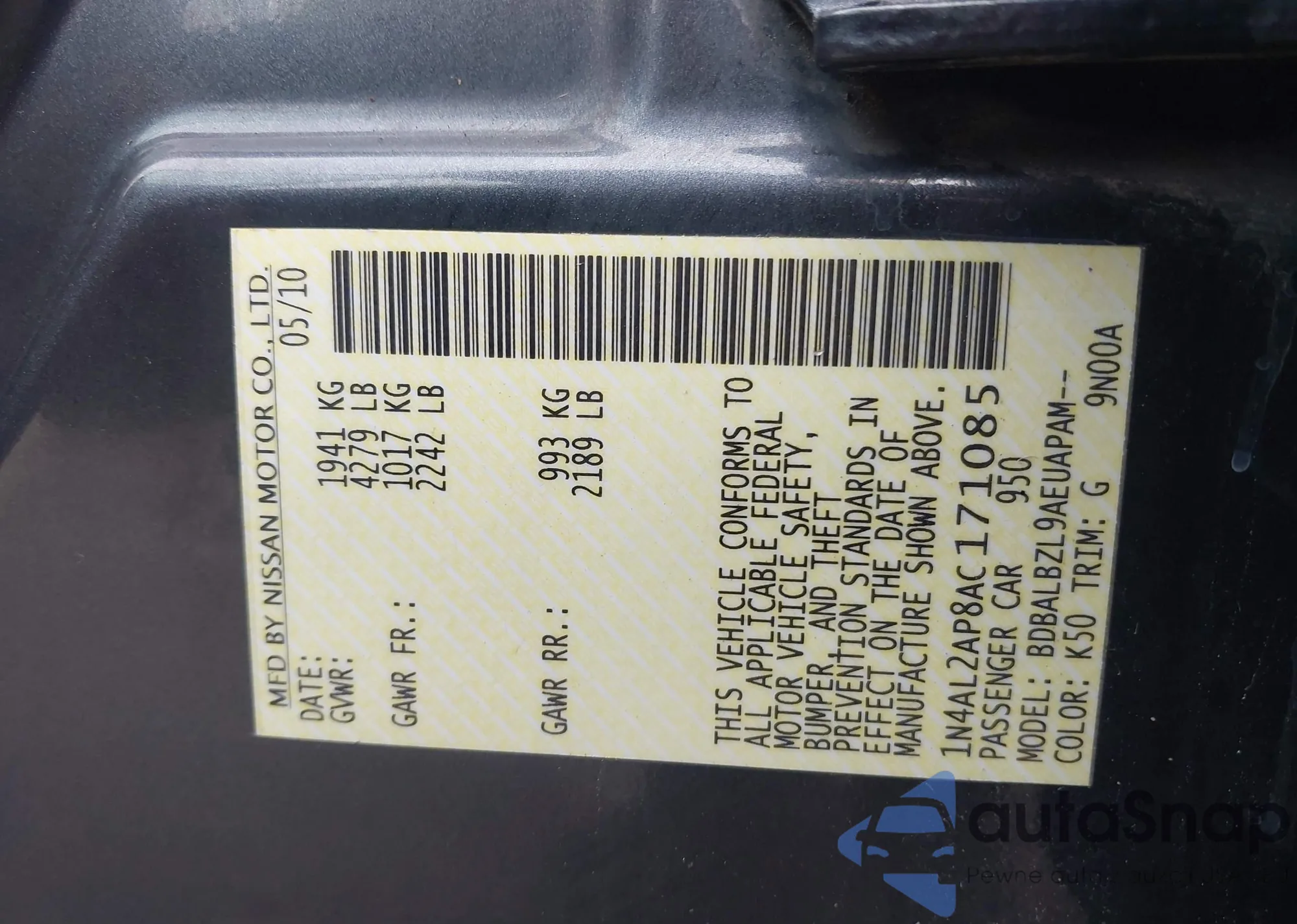 LOT: 42700437 VIN: 1N4AL2AP8AC171085
