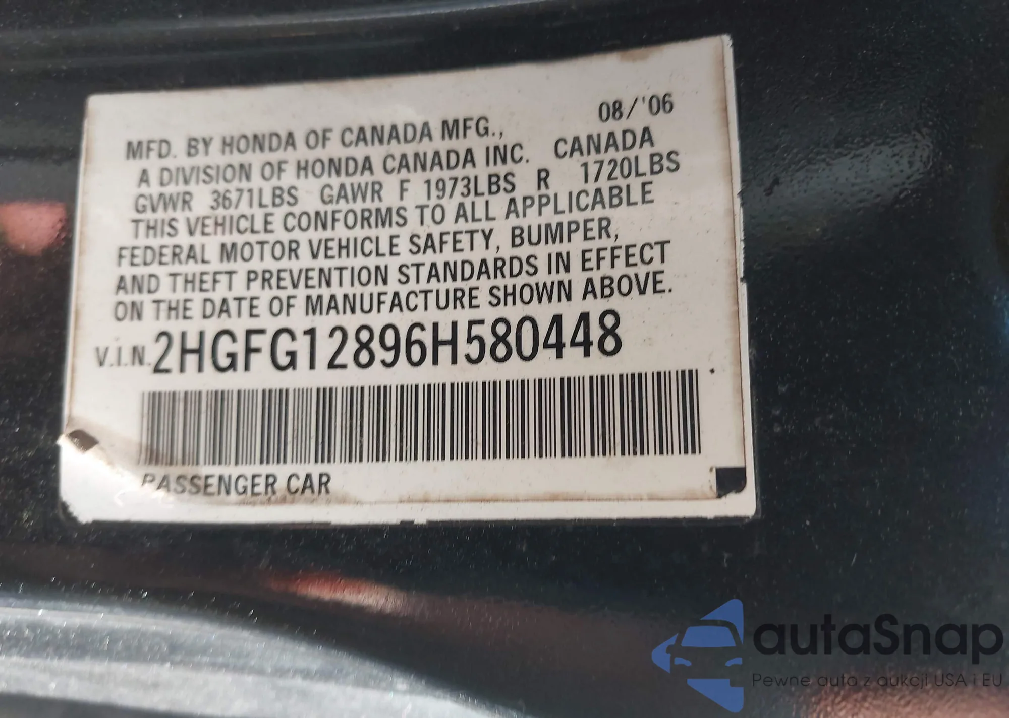LOT: 42765499 VIN: 2HGFG12896H580448