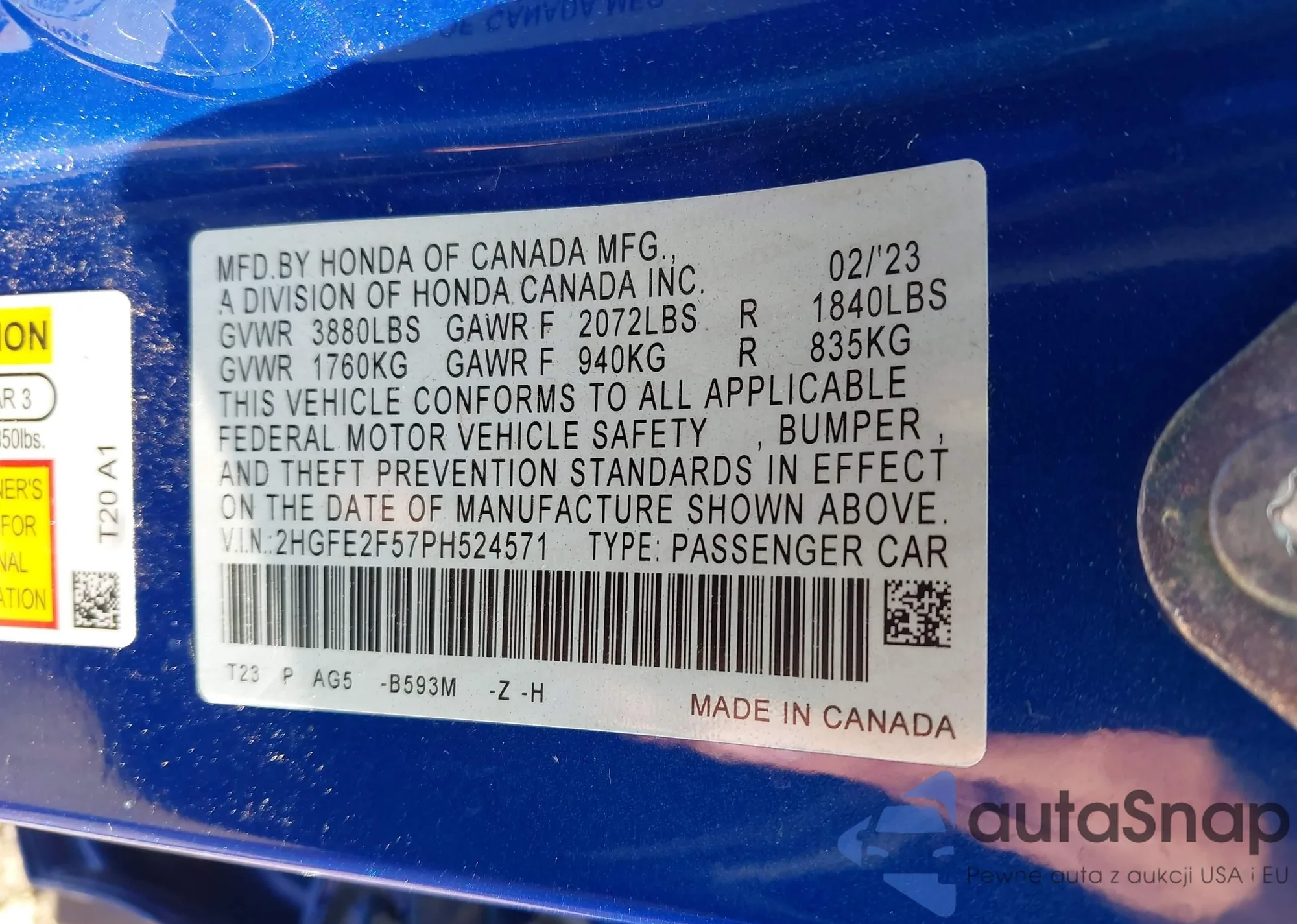 • VIN 2HGFE2F57PH524571