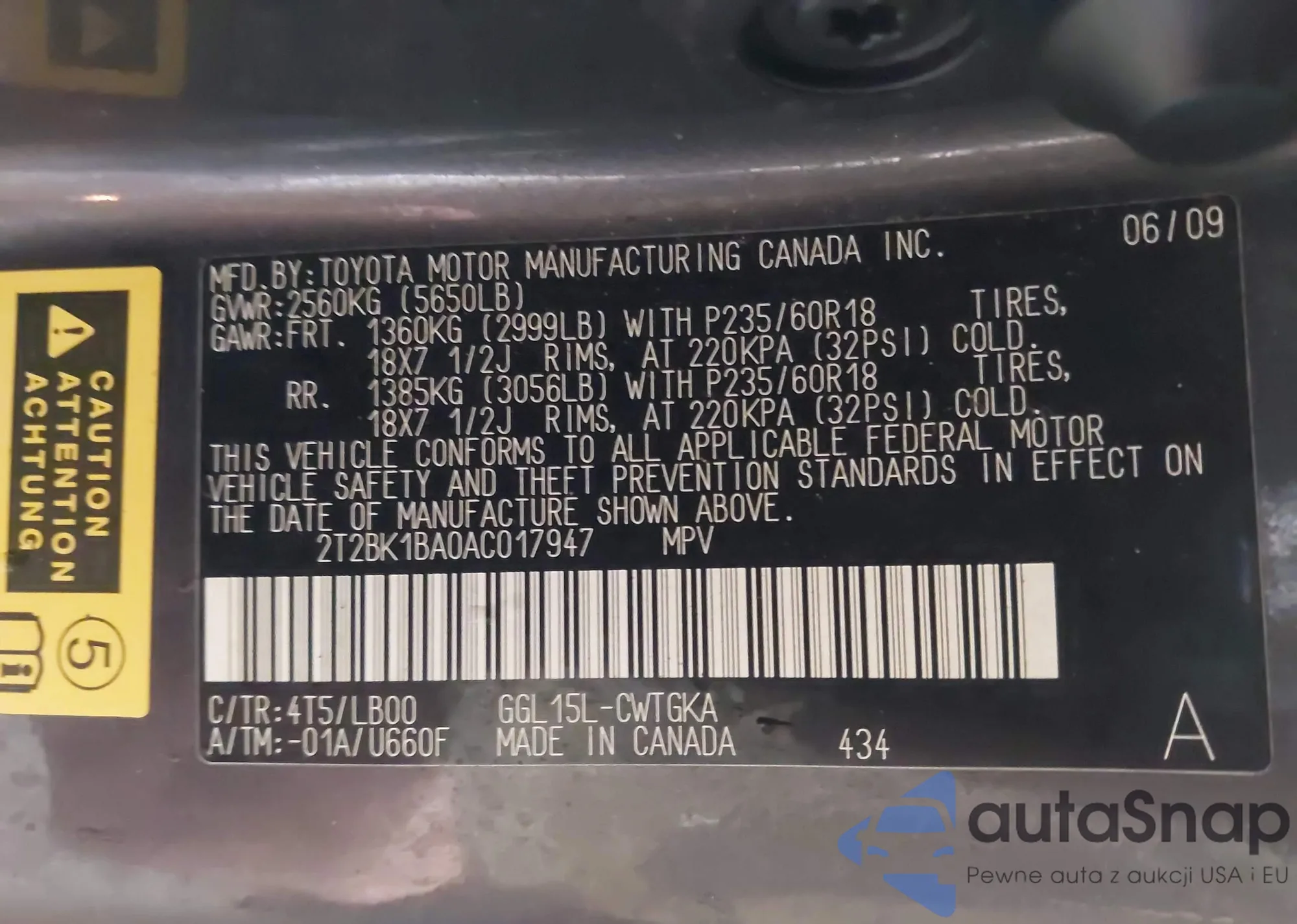 • VIN 2T2BK1BA0AC017947