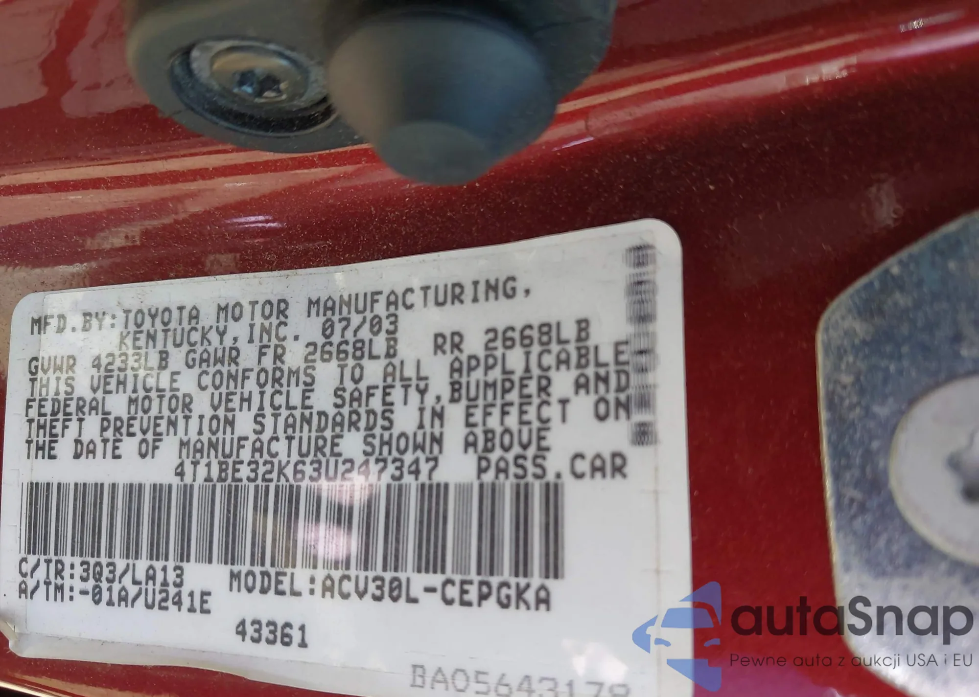 LOT: 42836788 VIN: 4T1BE32K63U247347