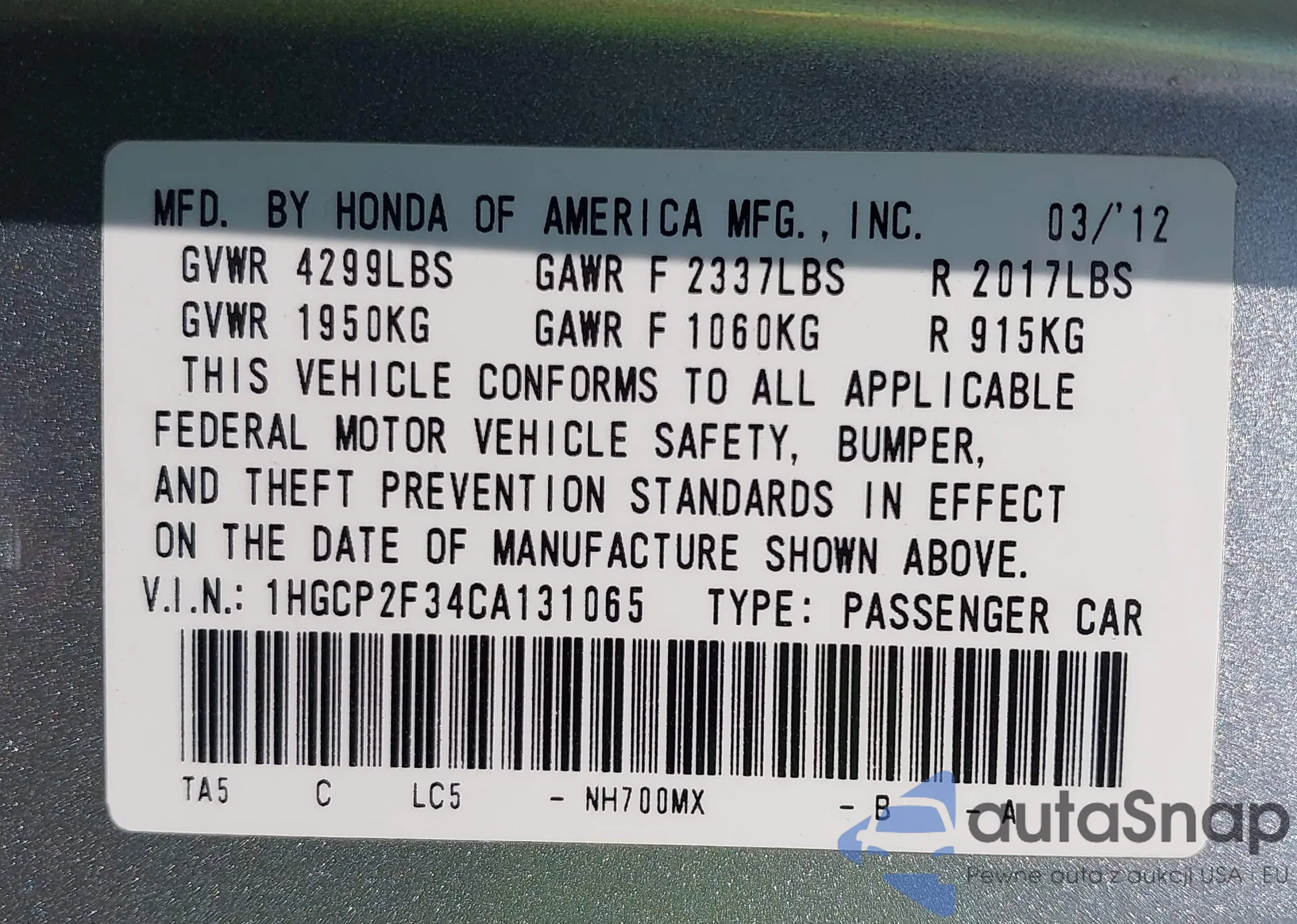 LOT: 42924750 VIN: JHMZC5F30JC011351
