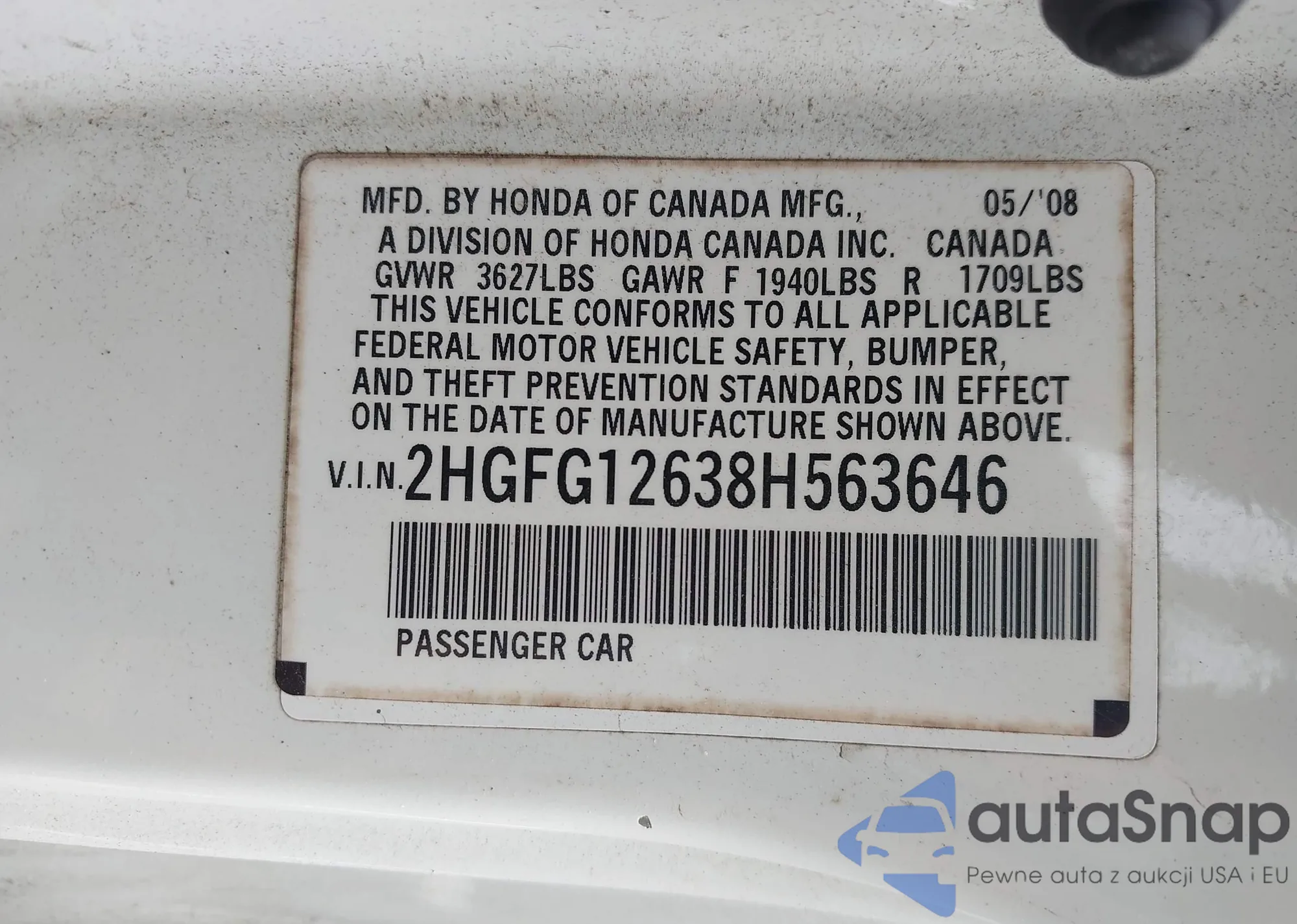 LOT: 42971977 VIN: 2HGFG12638H563646