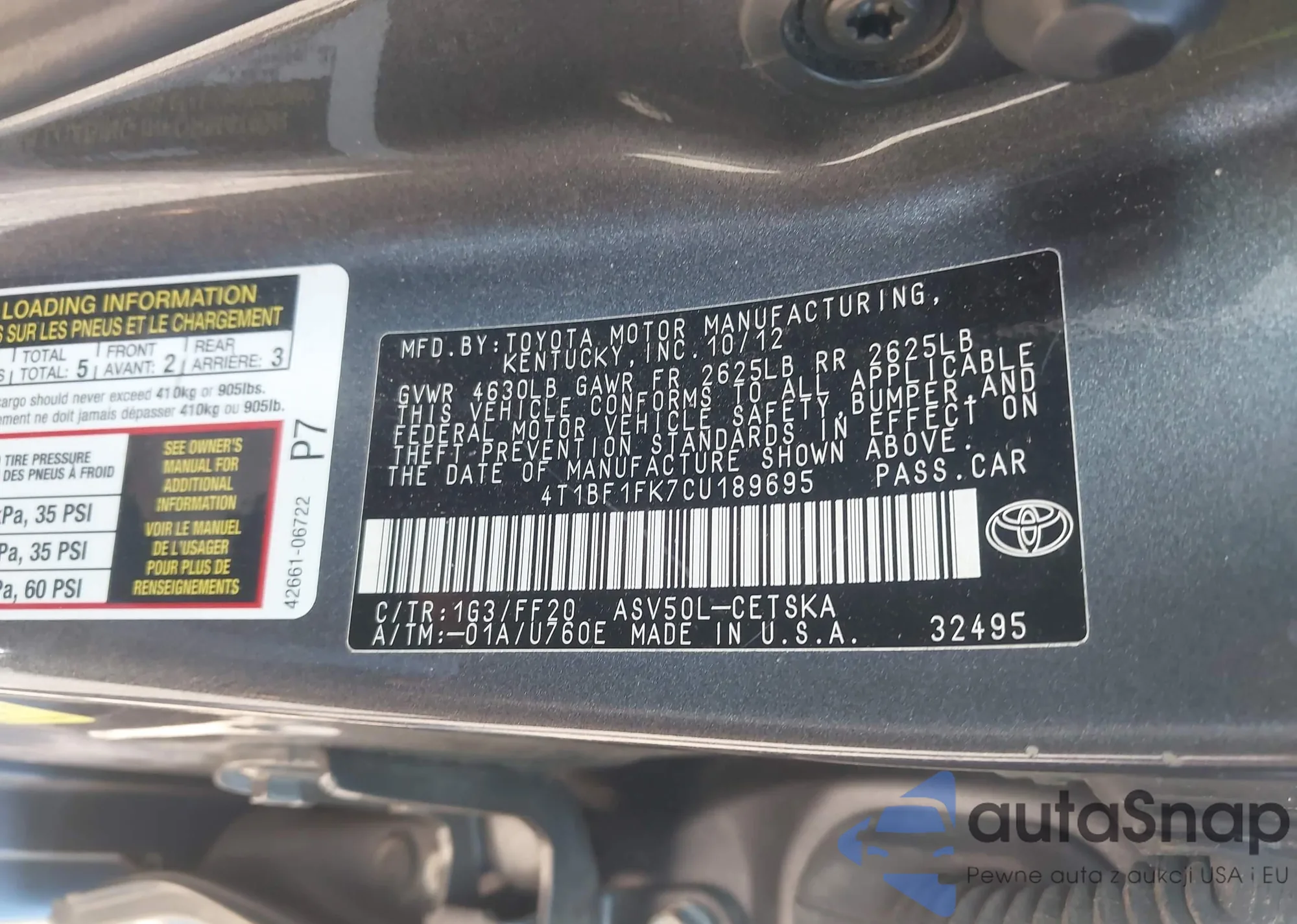 • VIN 4T1BF1FK7CU189695