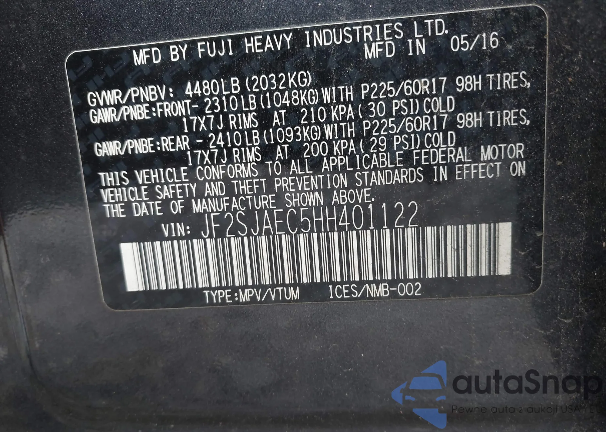 • VIN JF2SJAEC5HH401122
