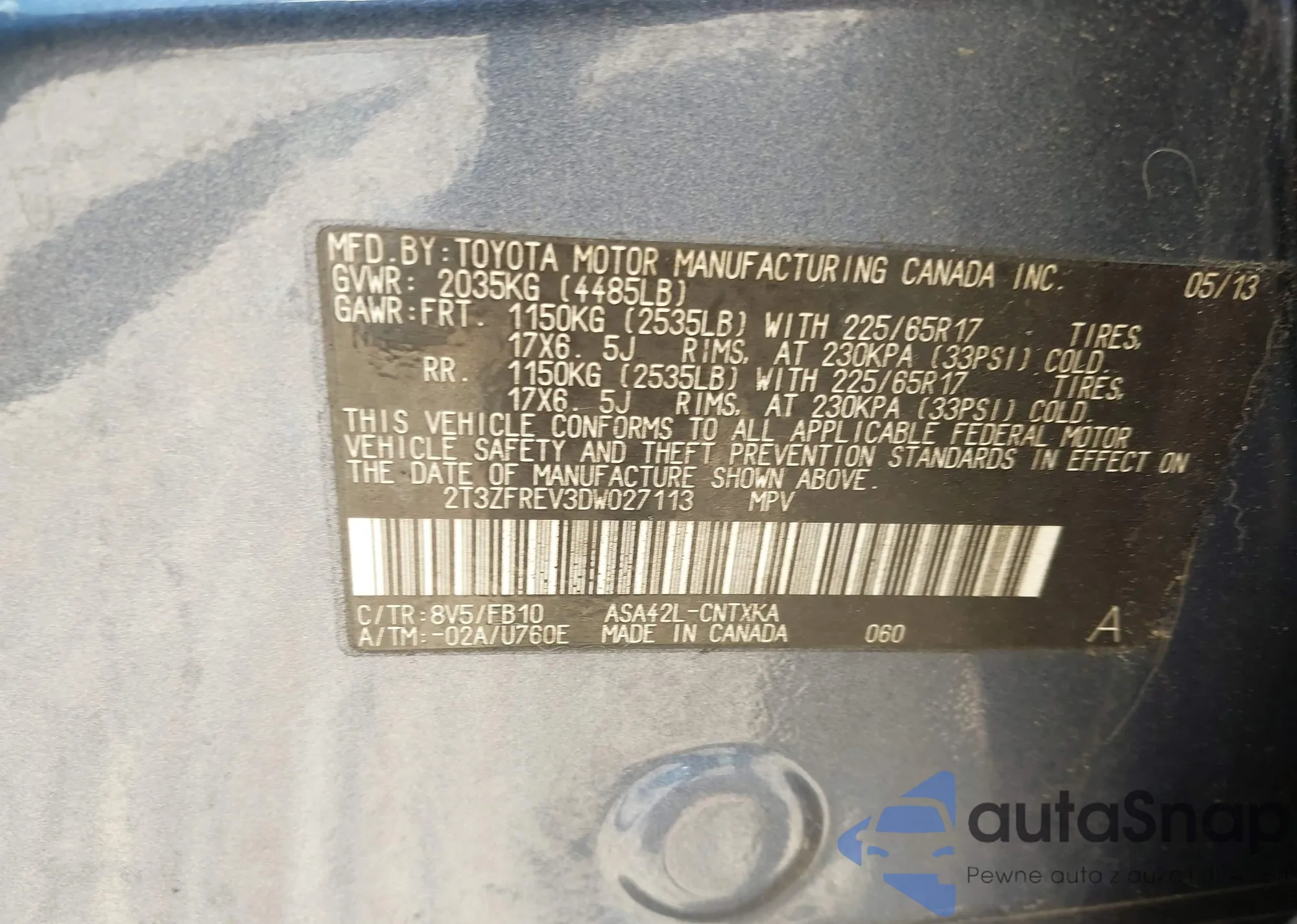 • VIN 2T3ZFREV3DW027113
