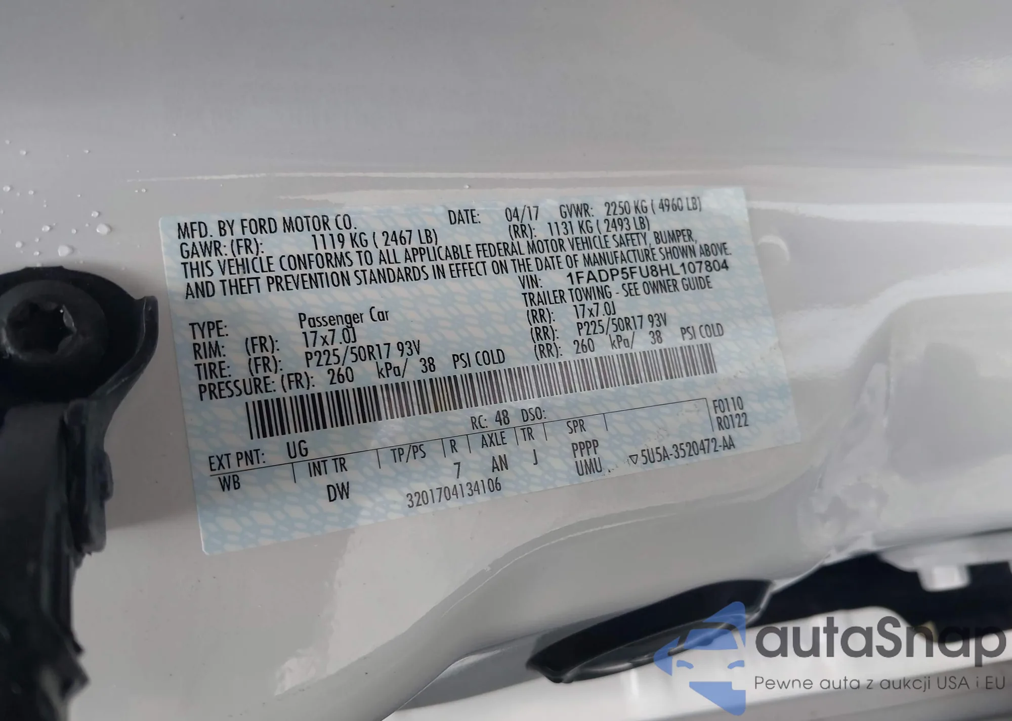LOT: 43014172 VIN: 1FADP5FU8HL107804