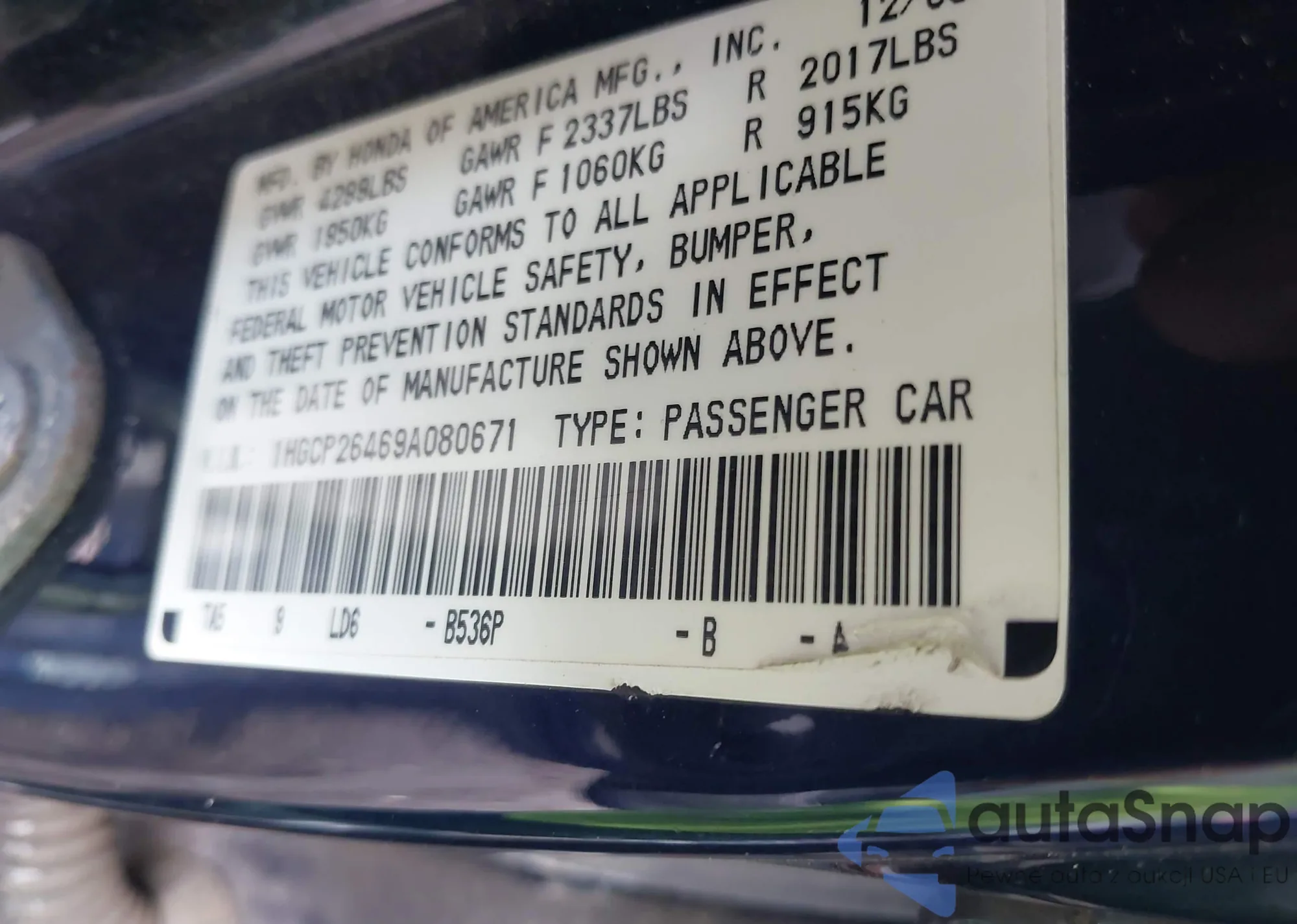 LOT: 43018471 VIN: 1HGCP26469A080671