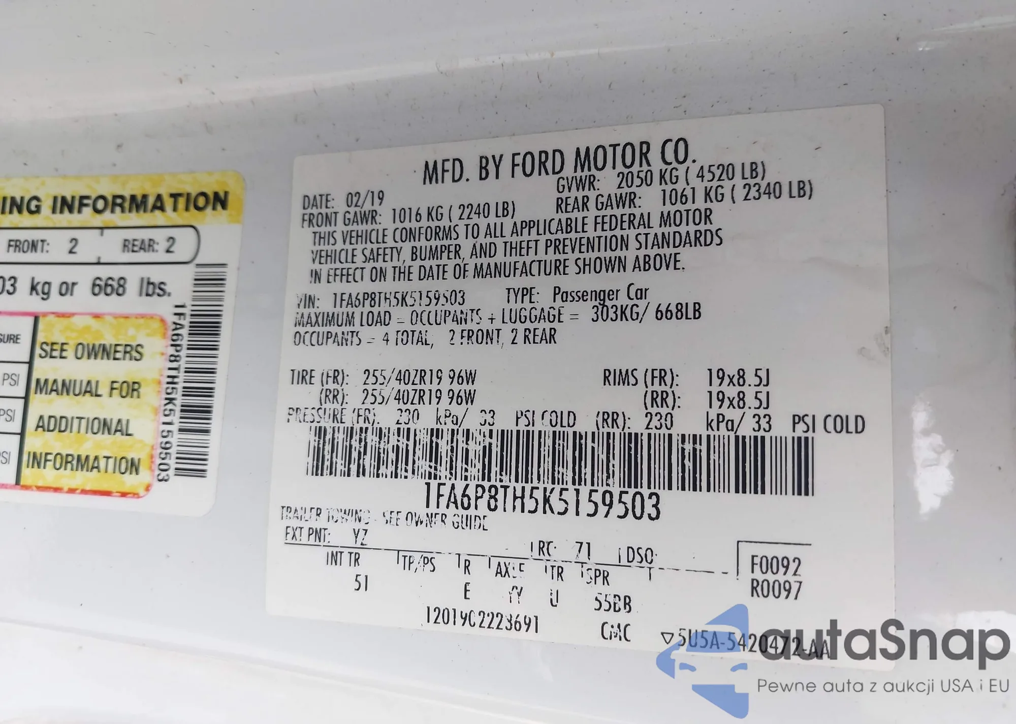 • VIN 1FA6P8TH5K5159503