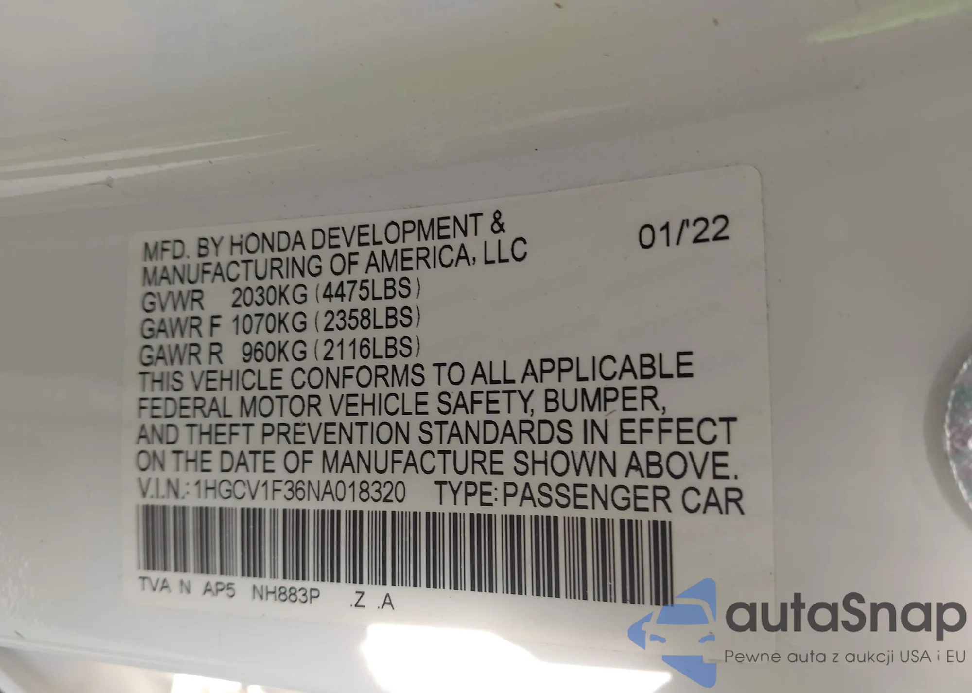 LOT: 42881317 VIN: 1HGCV1F36NA018320