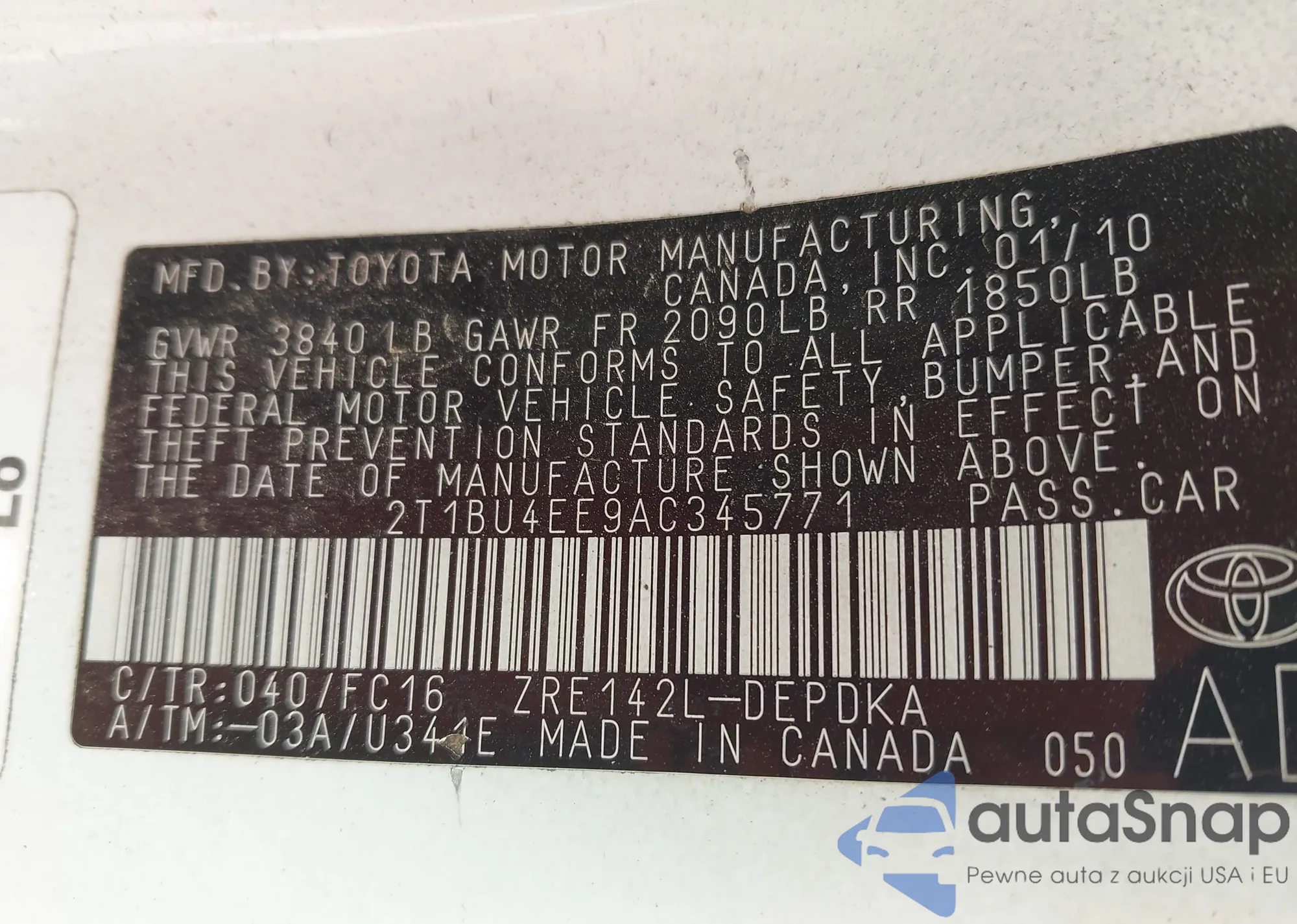 • VIN 2T1BU4EE9AC345771