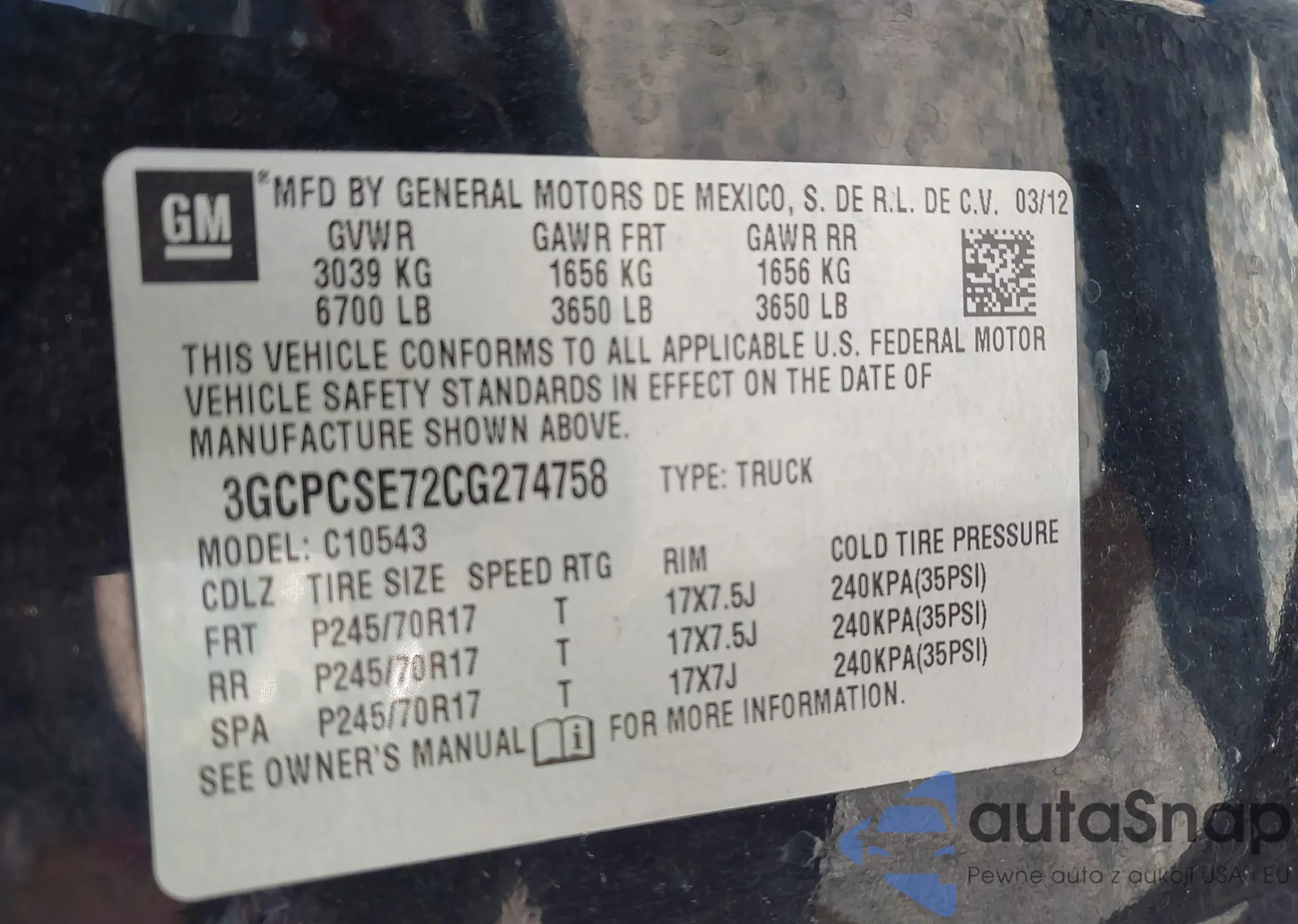 • VIN 3GCPCSE72CG274758