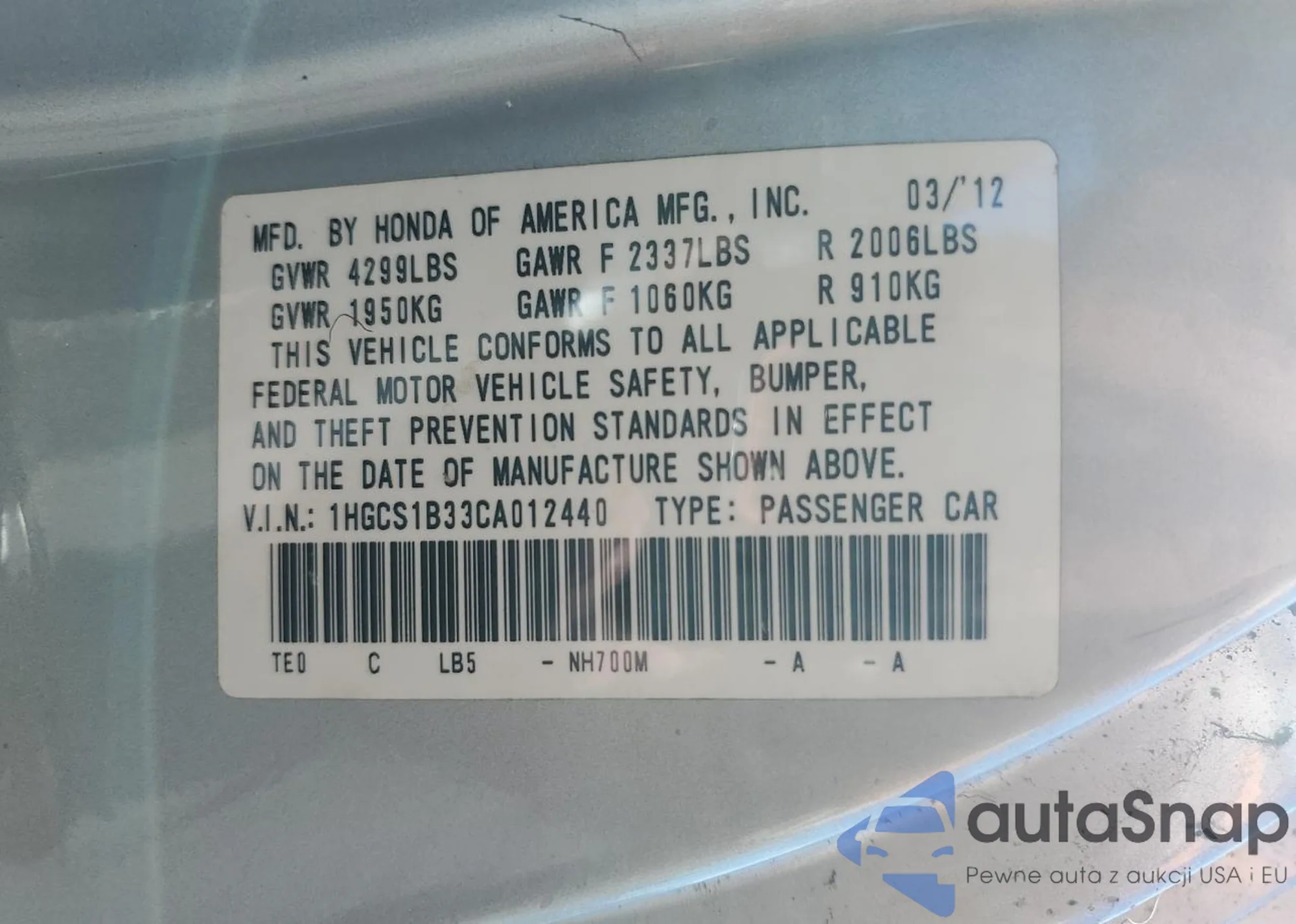 • VIN 1HGCS1B33CA012440