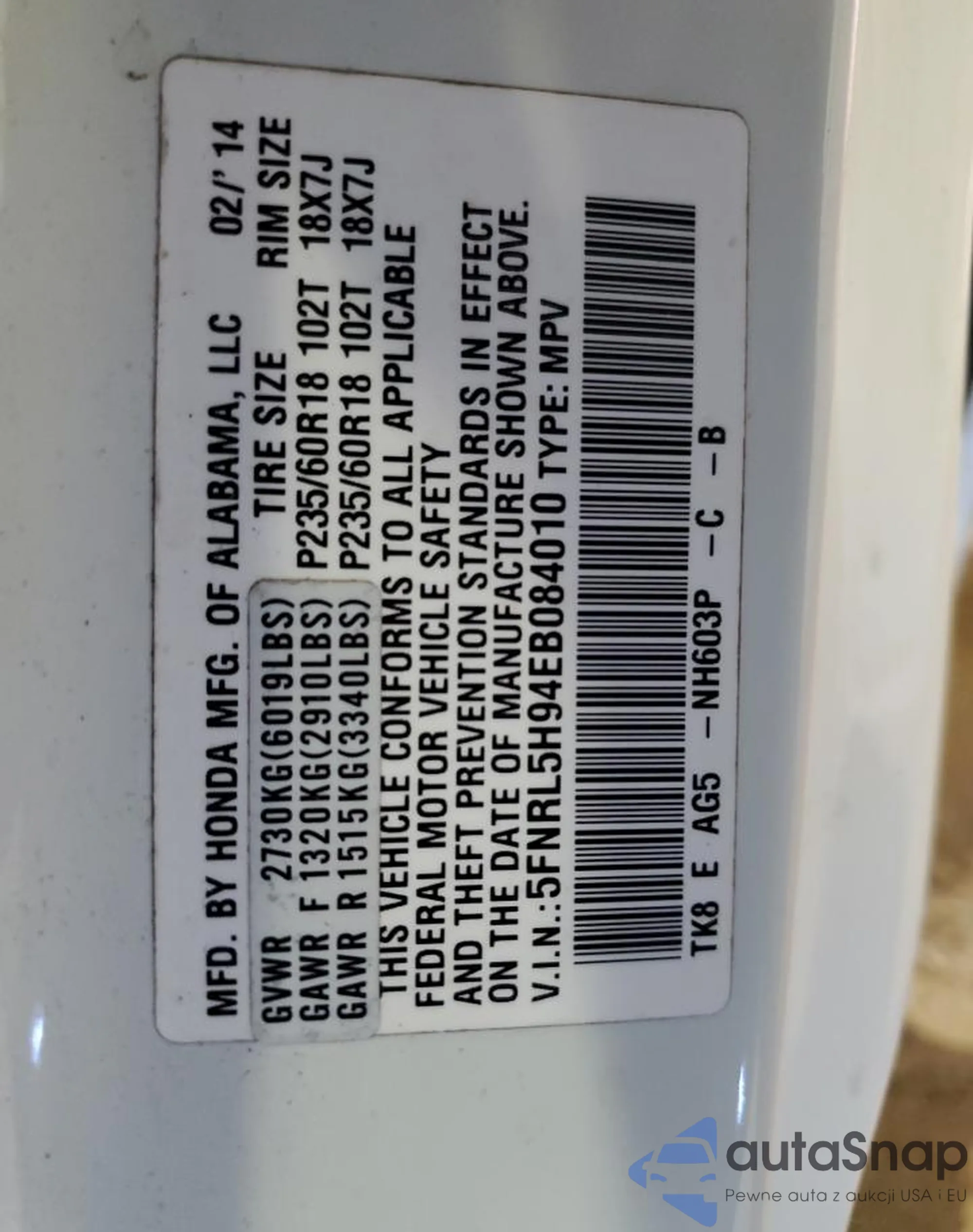 • VIN 5FNRL5H94EB084010