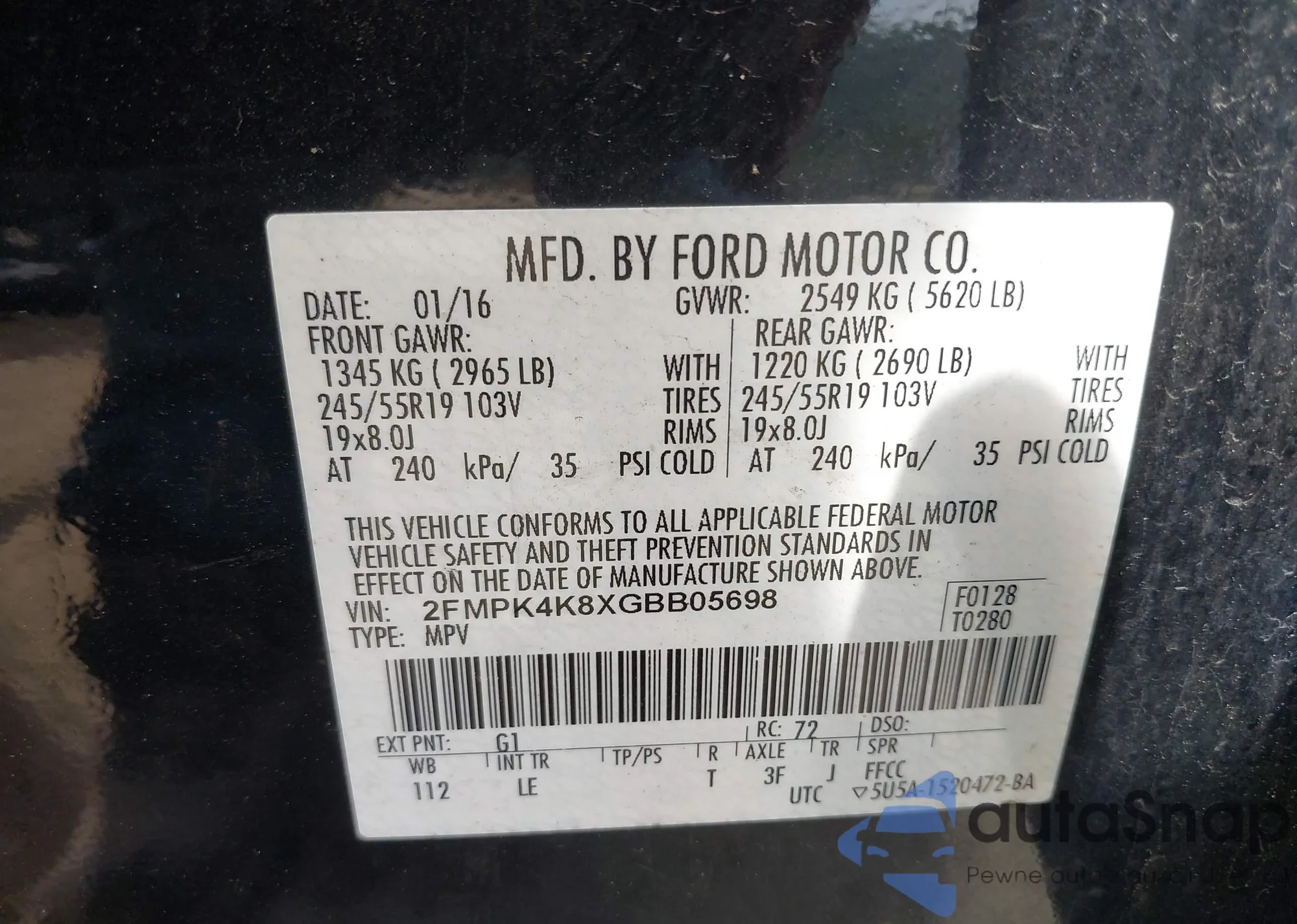 • VIN 2FMPK4K8XGBB05698