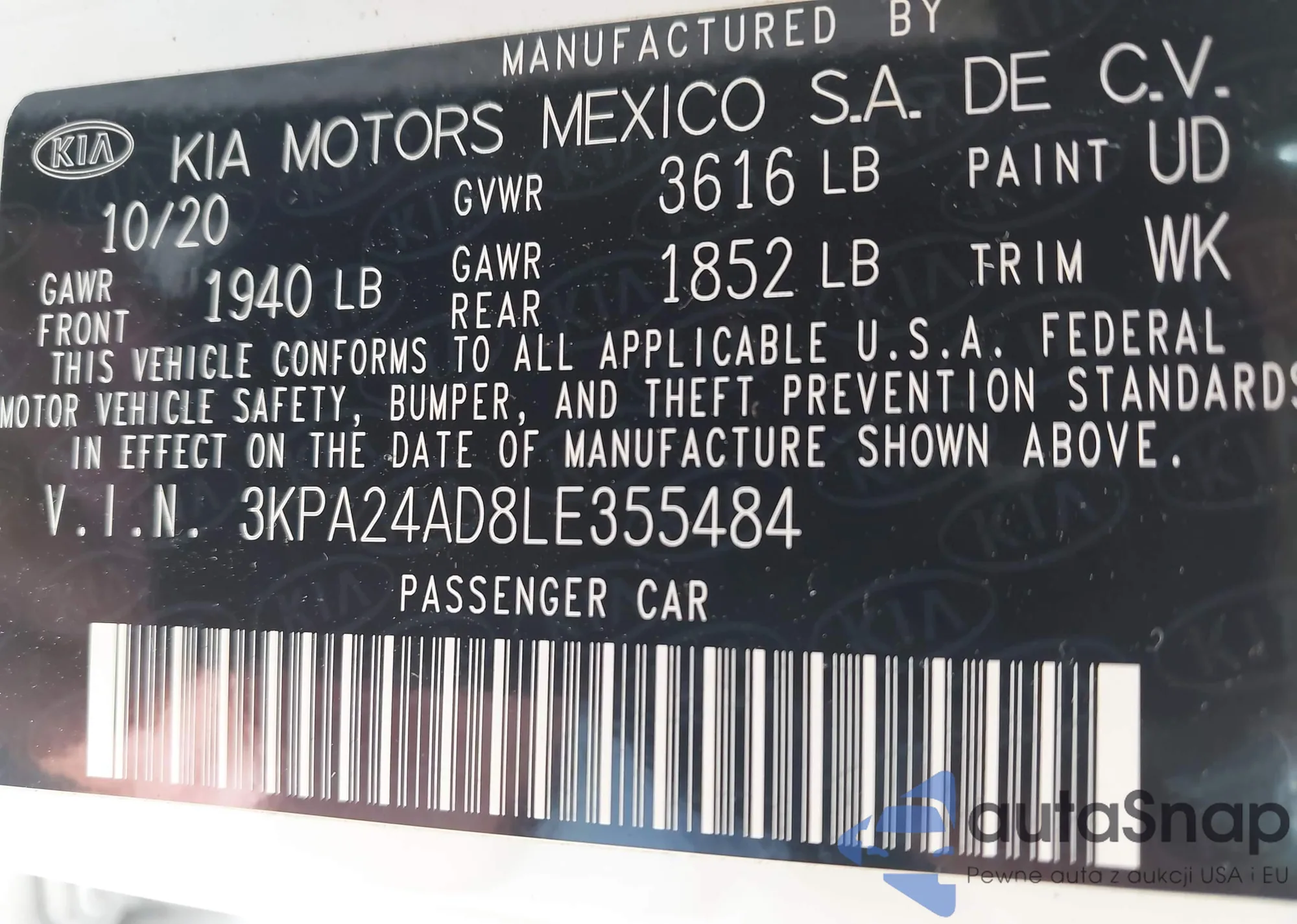 LOT: 42850324 VIN: 1HGCP3F8XAA022365