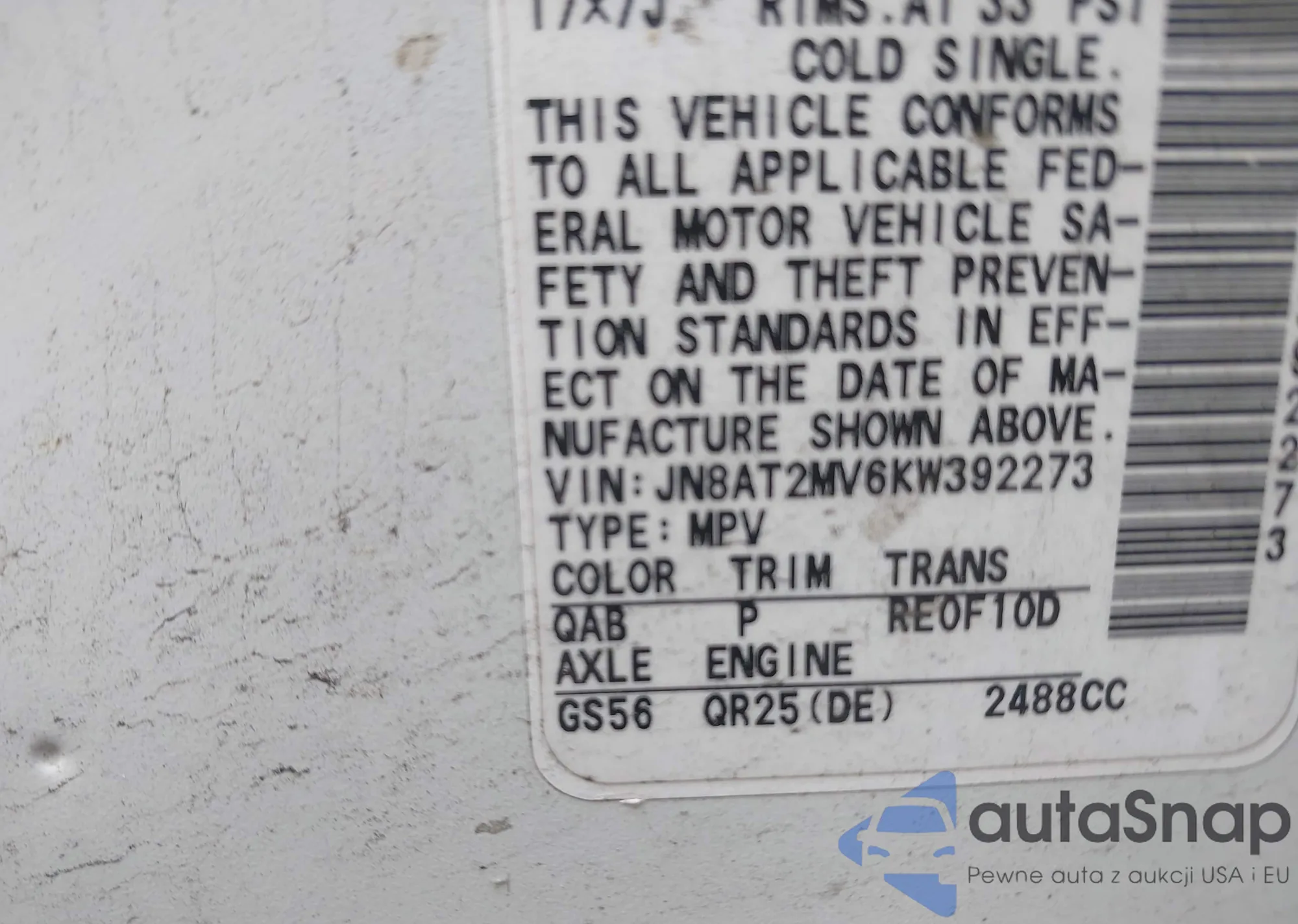 LOT: 42267276 VIN: JN8AT2MV6KW392273