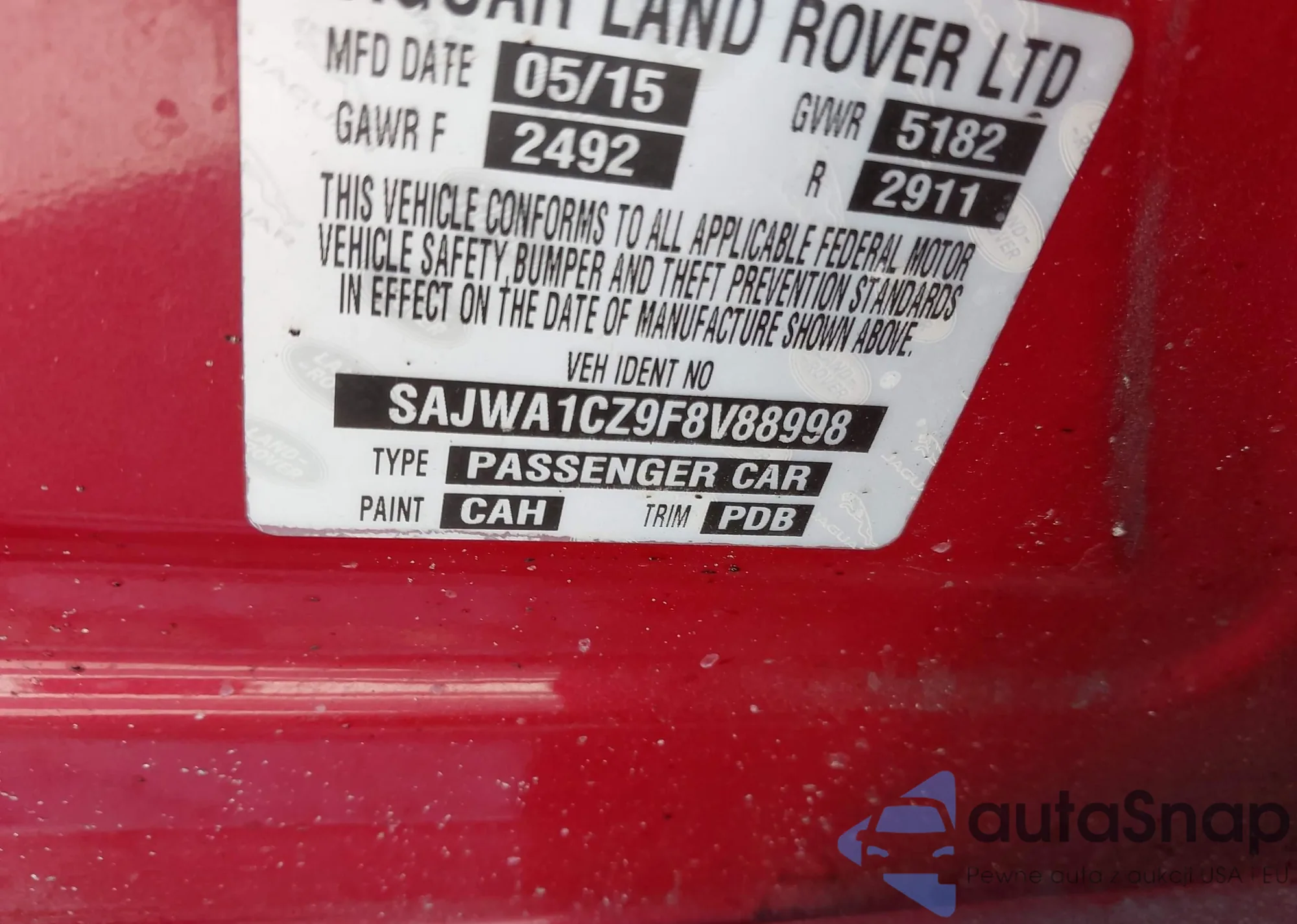 LOT: 42698359 VIN: SAJWA1CZ9F8V88998