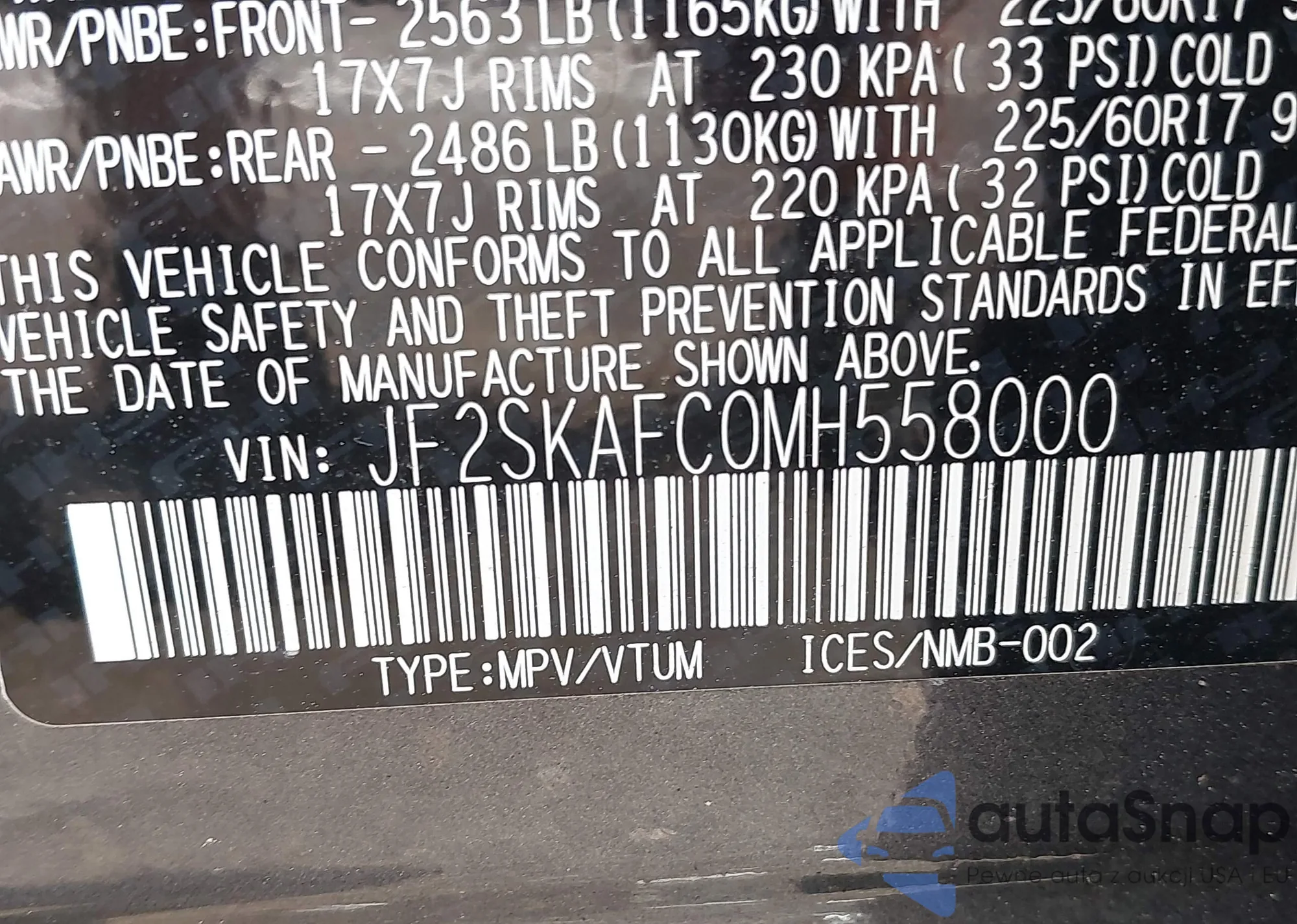 LOT: 42861189 VIN: JF2SKAFC0MH558000