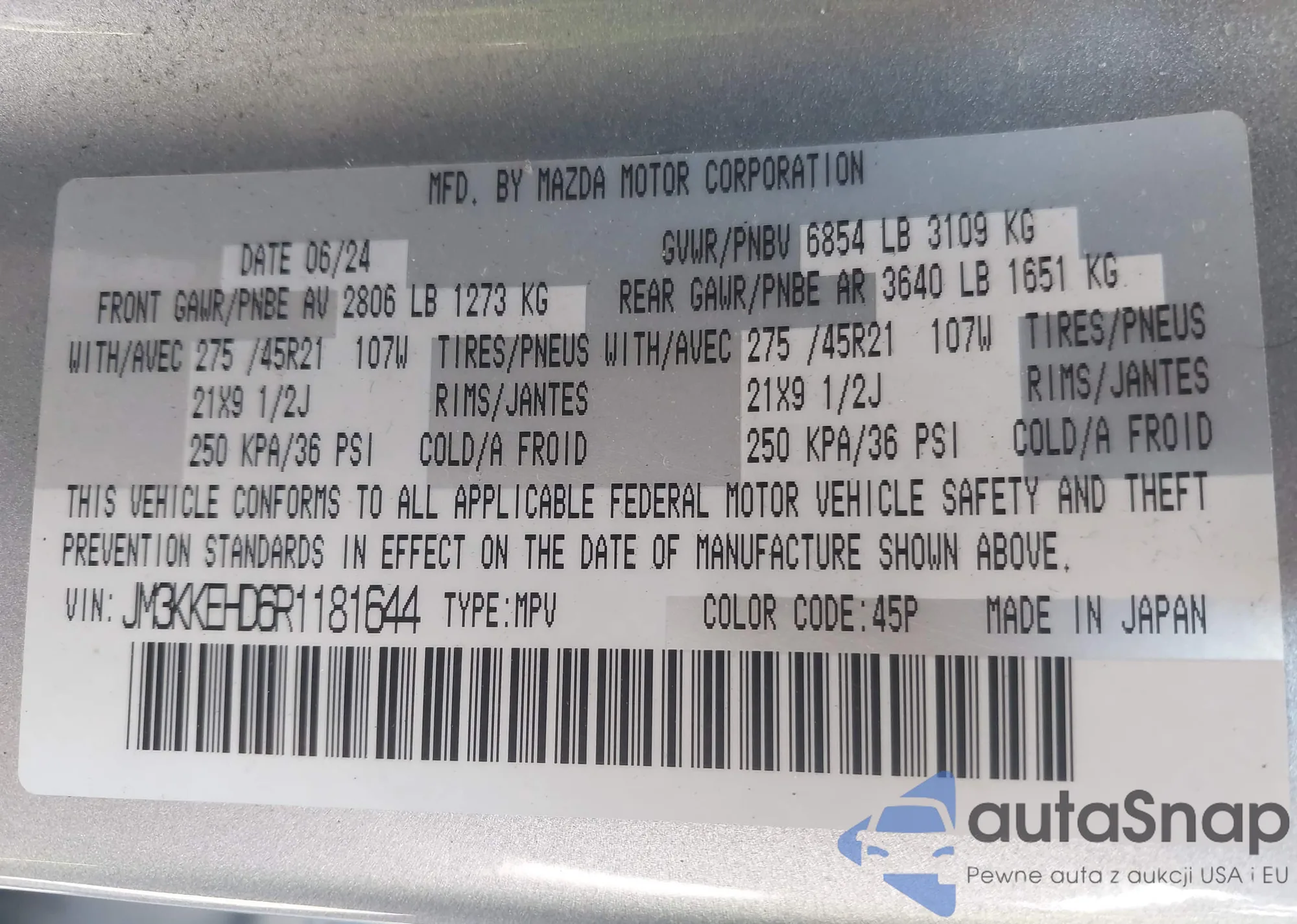 LOT: 42430070 VIN: JM3KKEHD6R1181644
