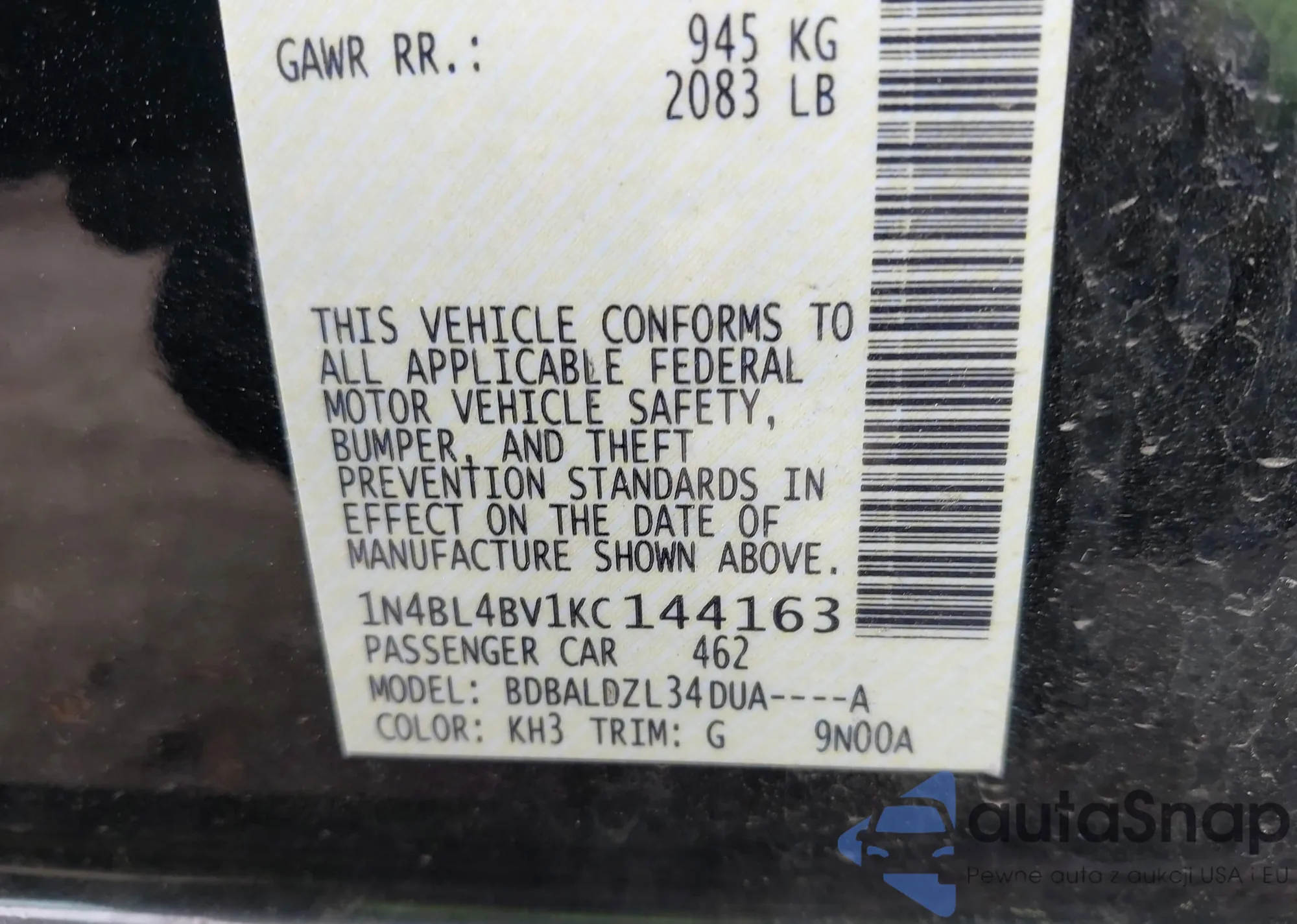 • VIN 1N4BL4BV1KC144163