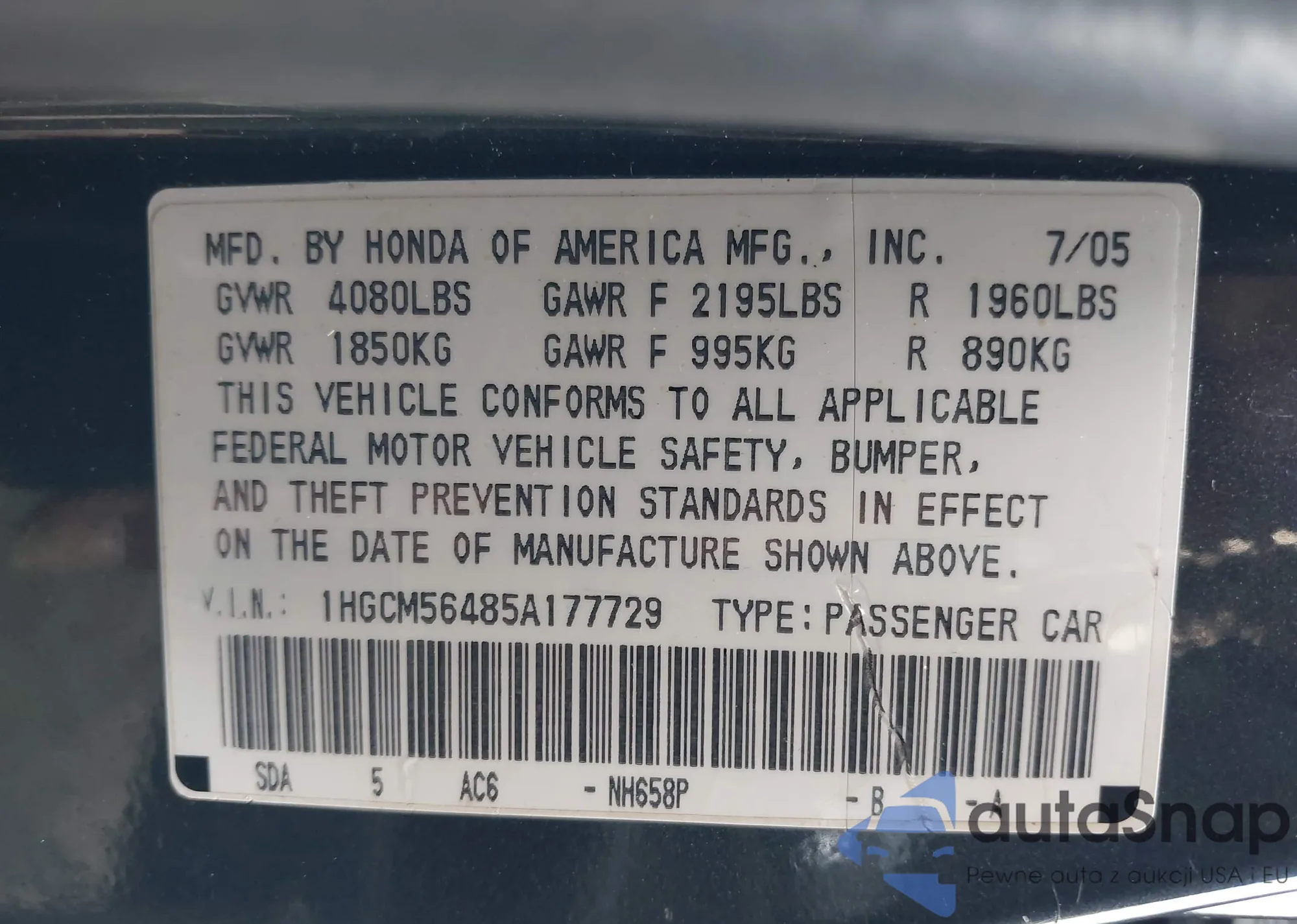 LOT: 43047904 VIN: 1HGCM56485A177729