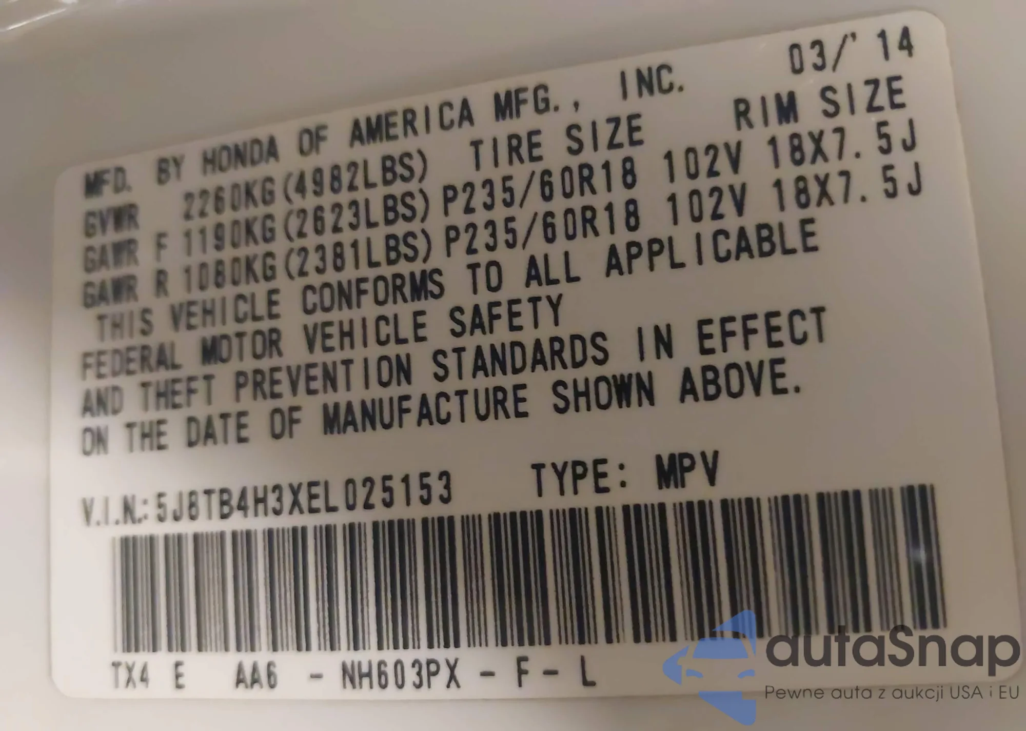 • VIN 5J8TB4H3XEL025153