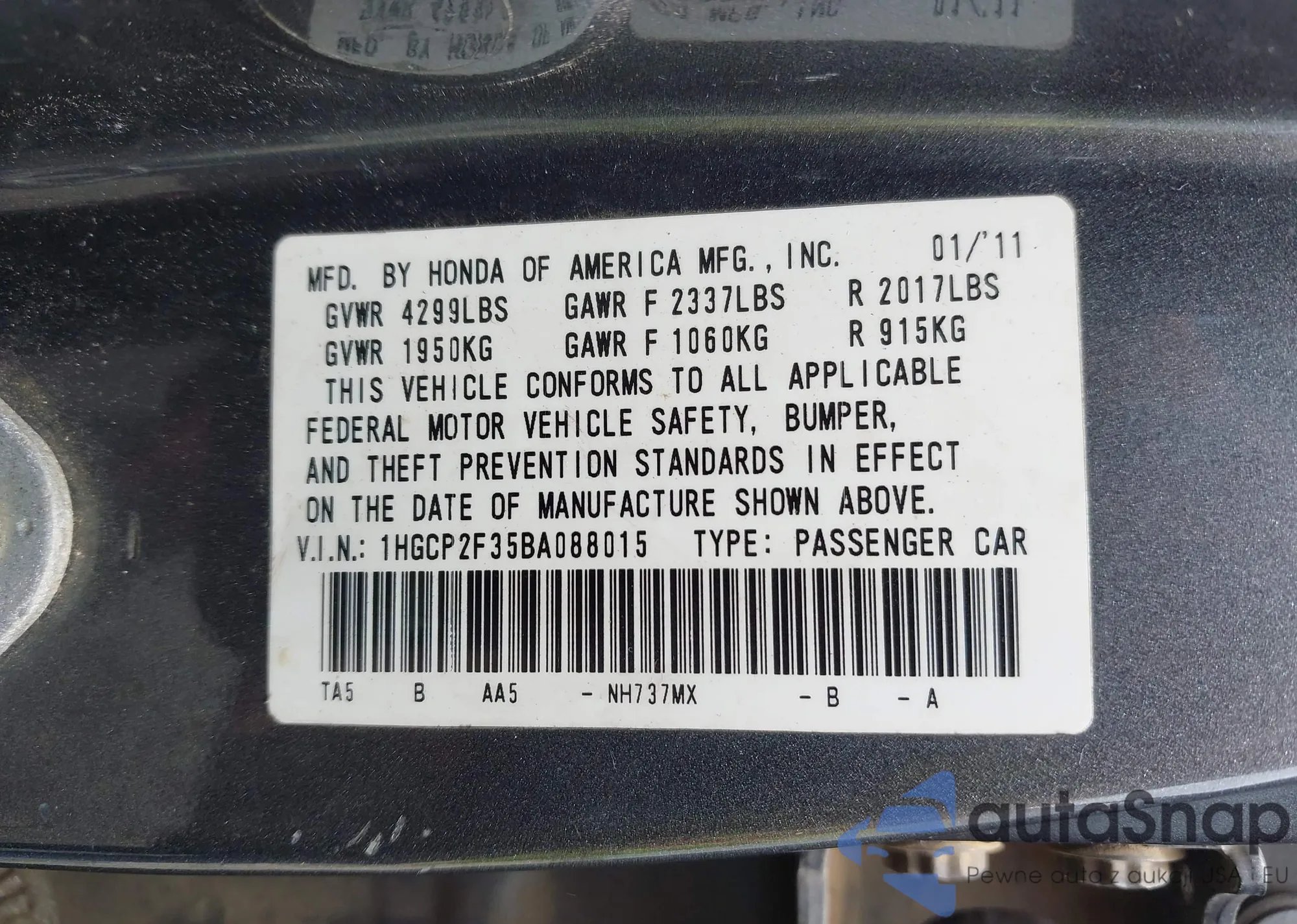 LOT: 42900460 VIN: 1HGCP2F35BA088015