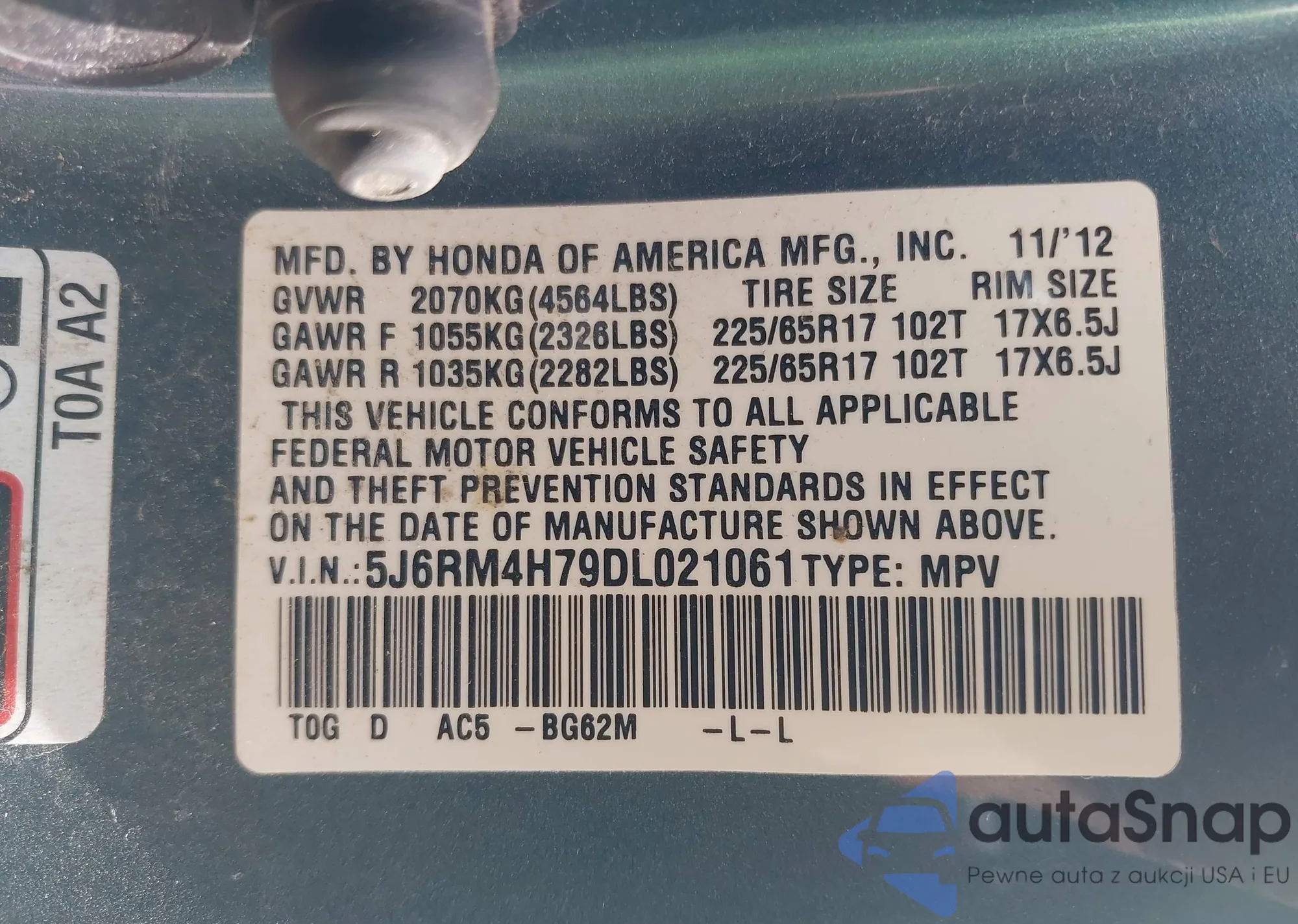 • VIN 5J6RM4H79DL021061