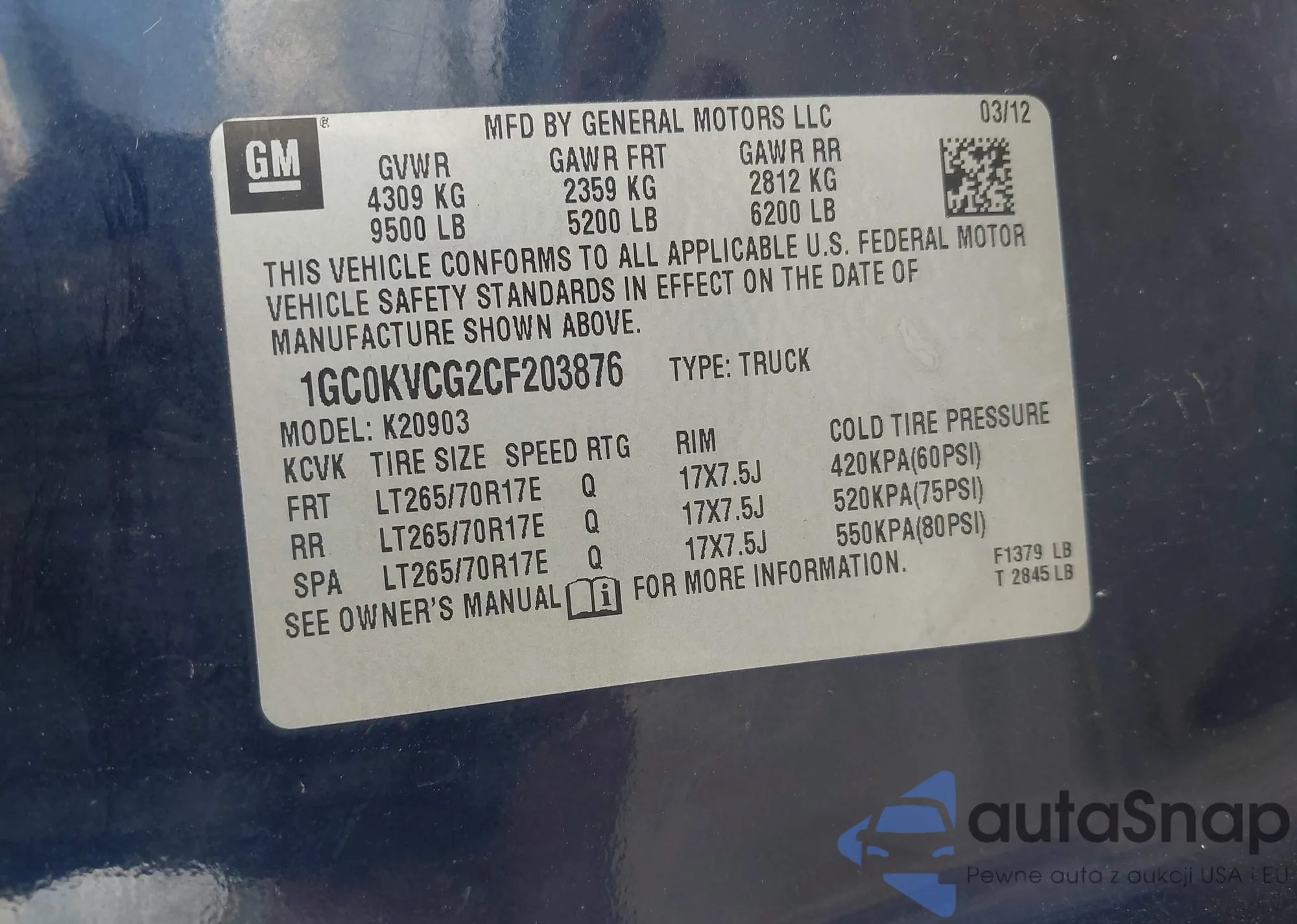 • VIN 1GC0KVCG2CF203876
