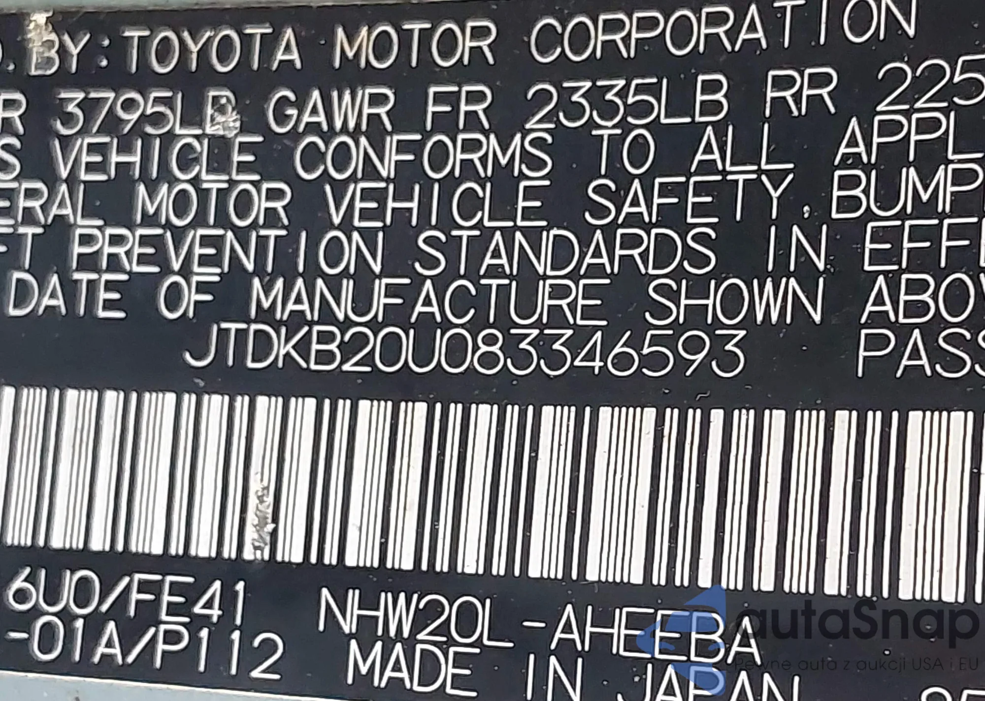 LOT: 42855363 VIN: JTDKB20U083346593