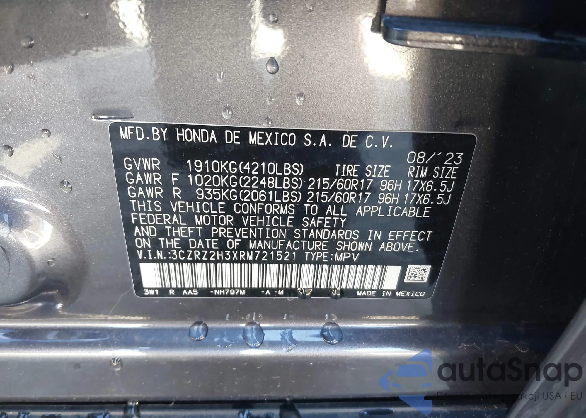 • VIN 3CZRZ2H3XRM721521