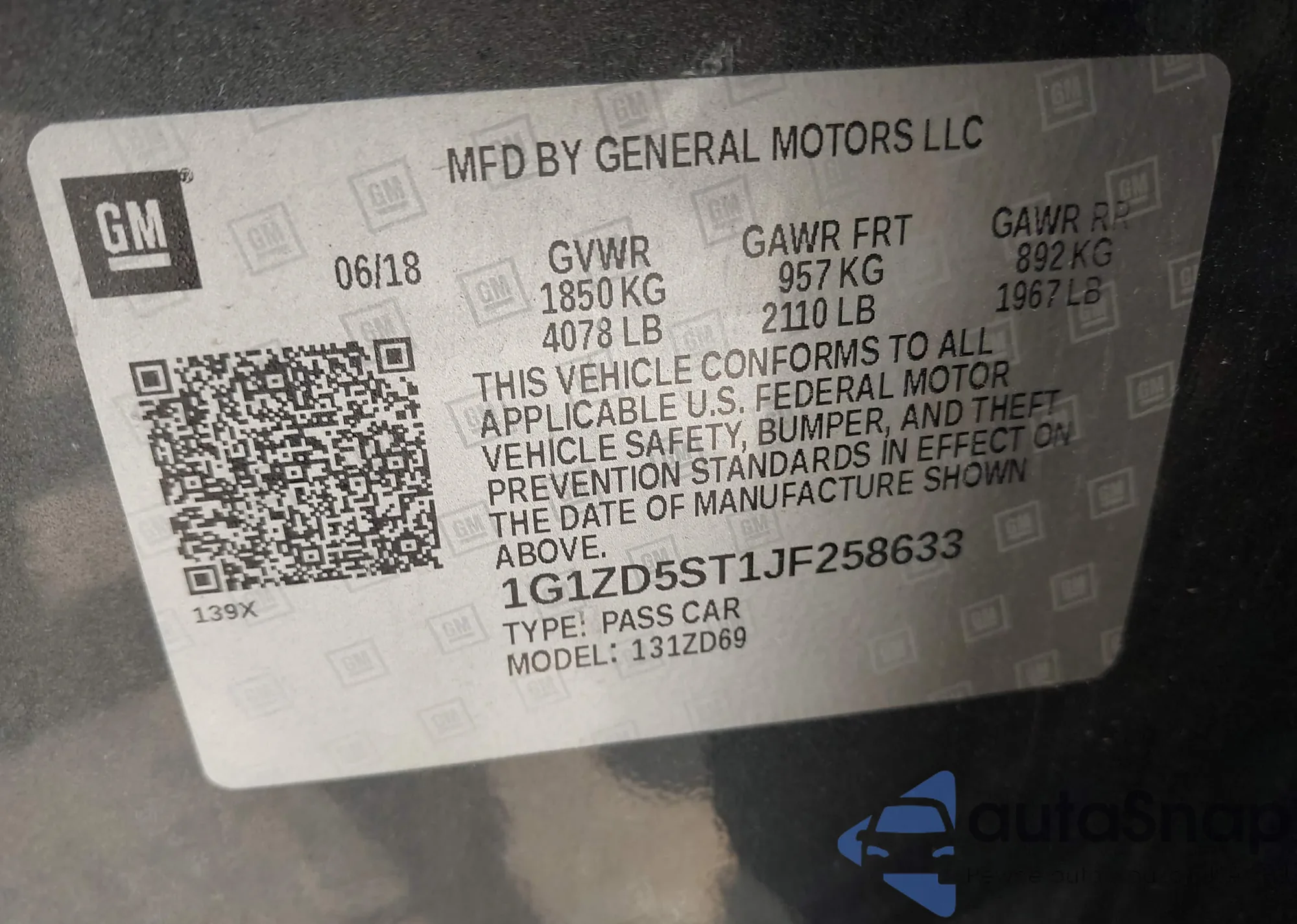 LOT: 42782553 VIN: 1G1ZD5ST1JF258633