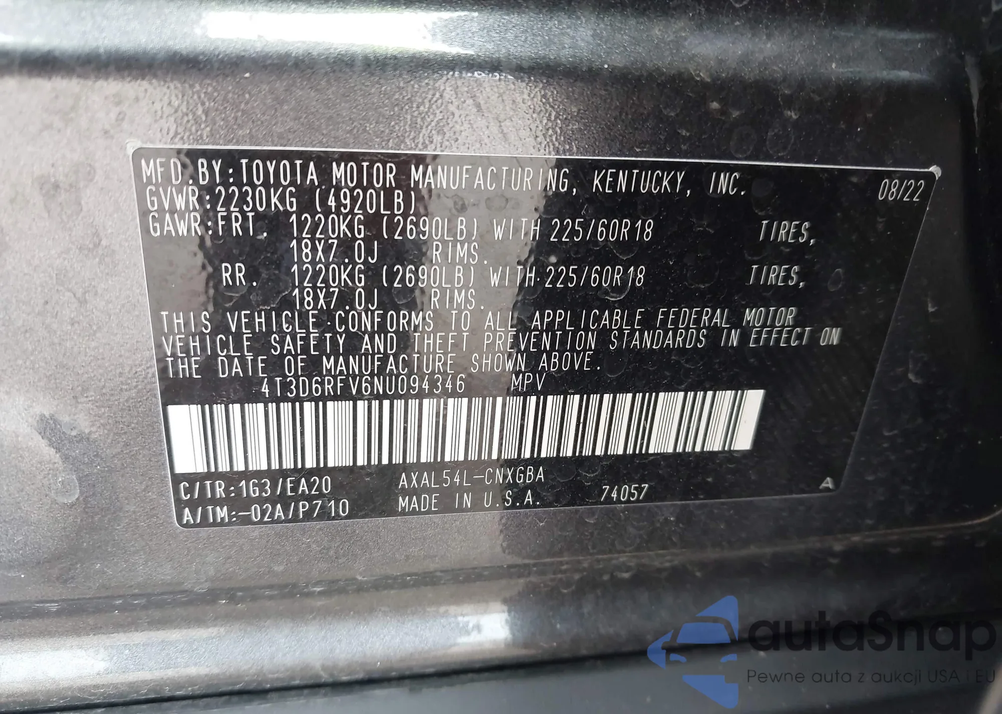• VIN 4T3D6RFV6NU094346