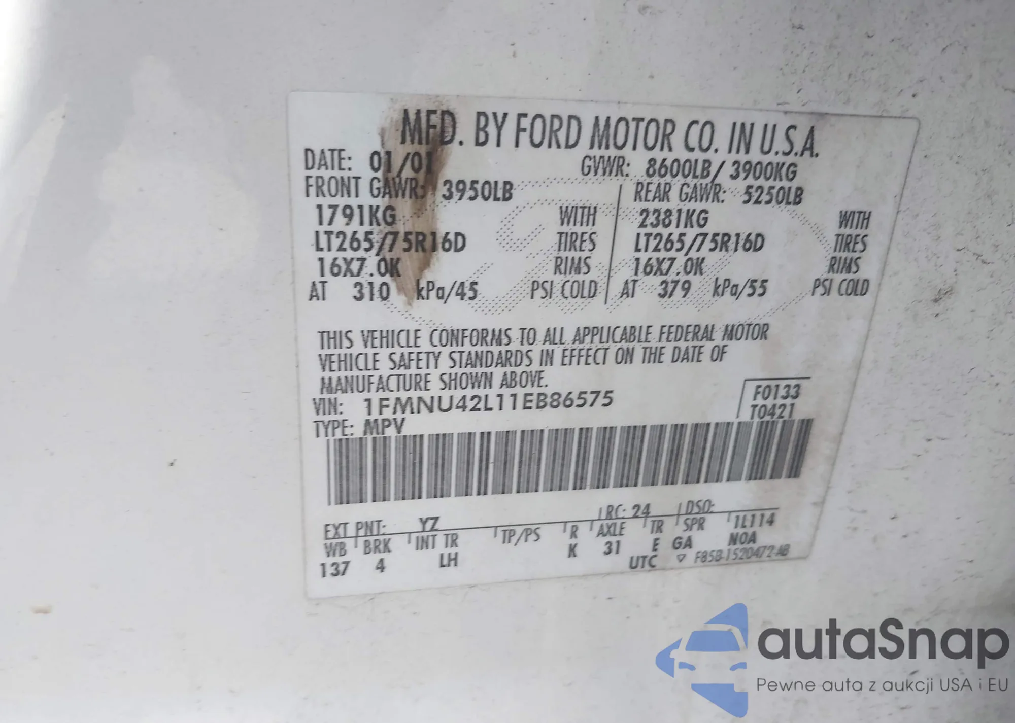 LOT: 42975658 VIN: 1FMNU42L11EB86575