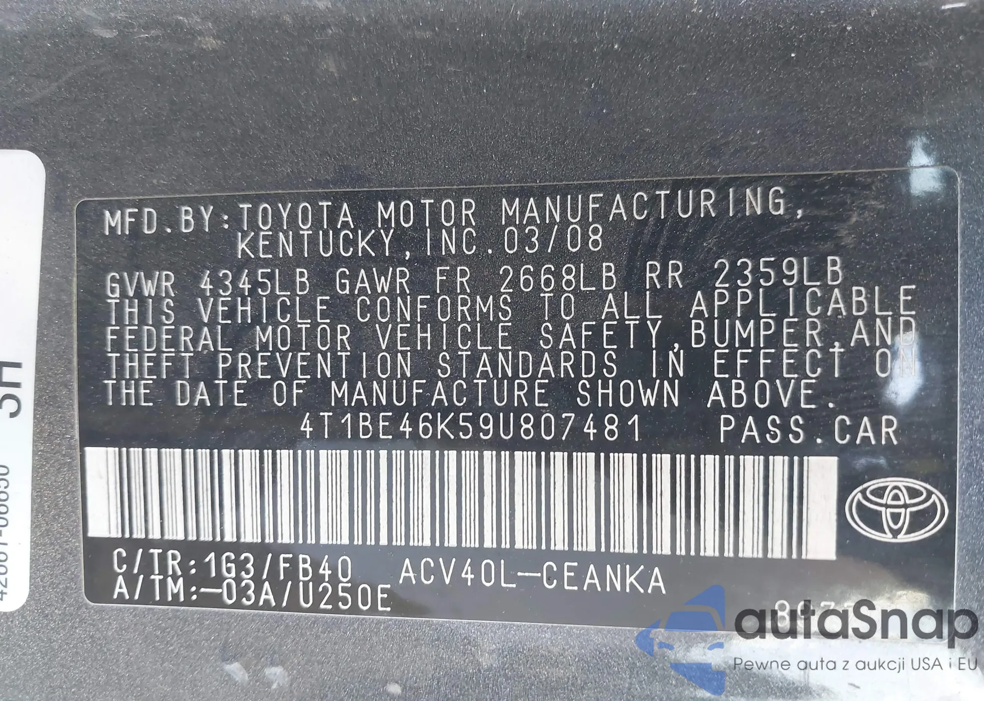 • VIN 4T1BE46K59U807481