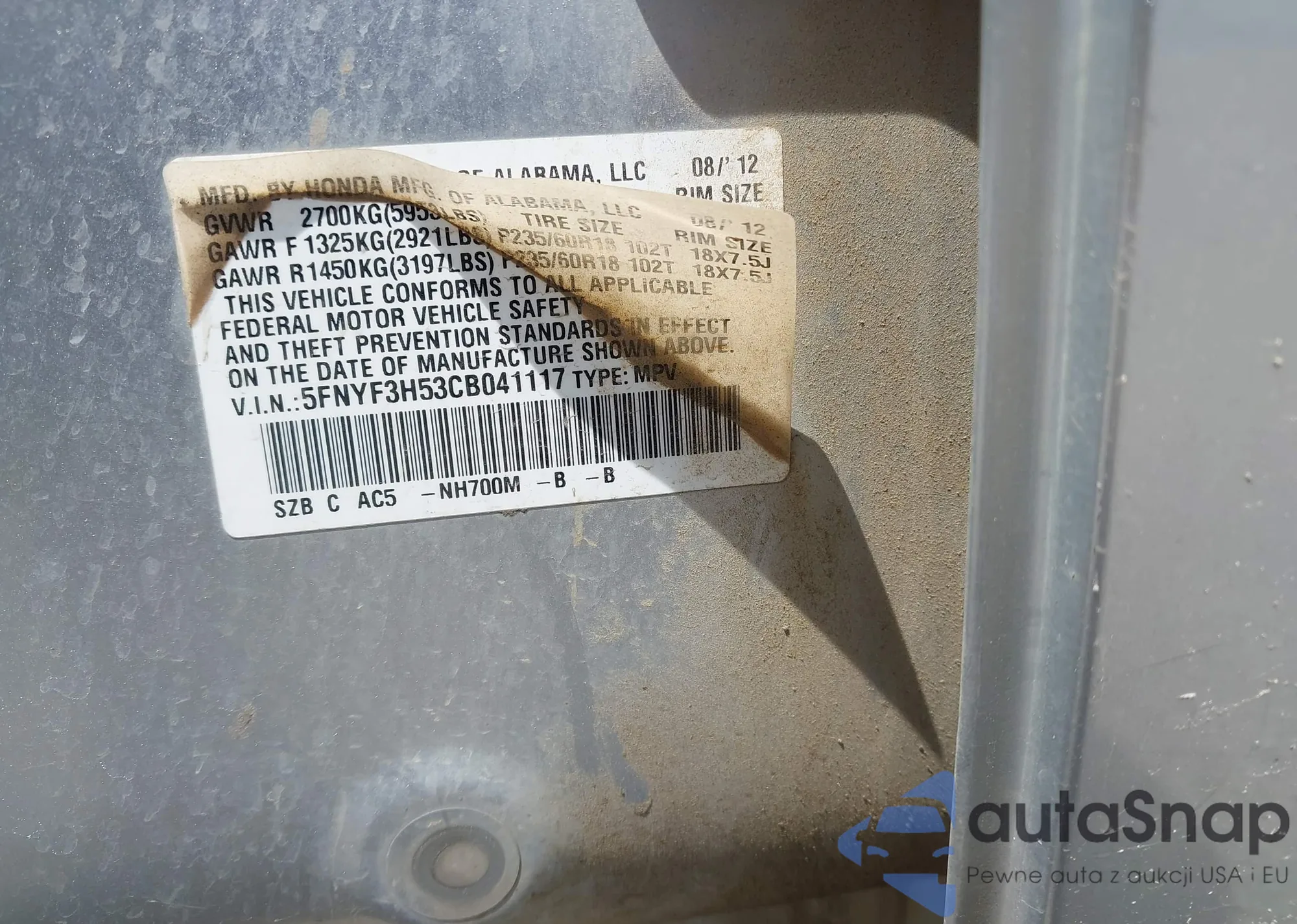 • VIN 5FNYF3H53CB041117