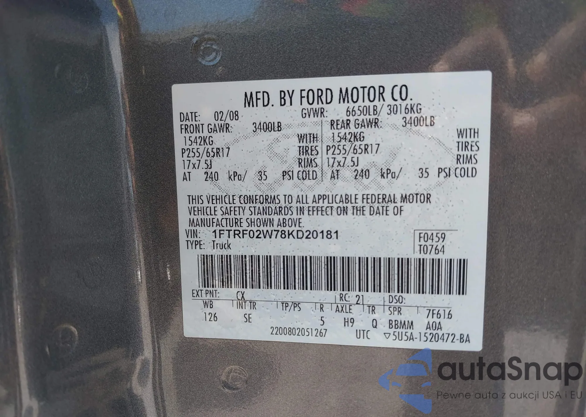 • VIN 1FTRF02W78KD20181