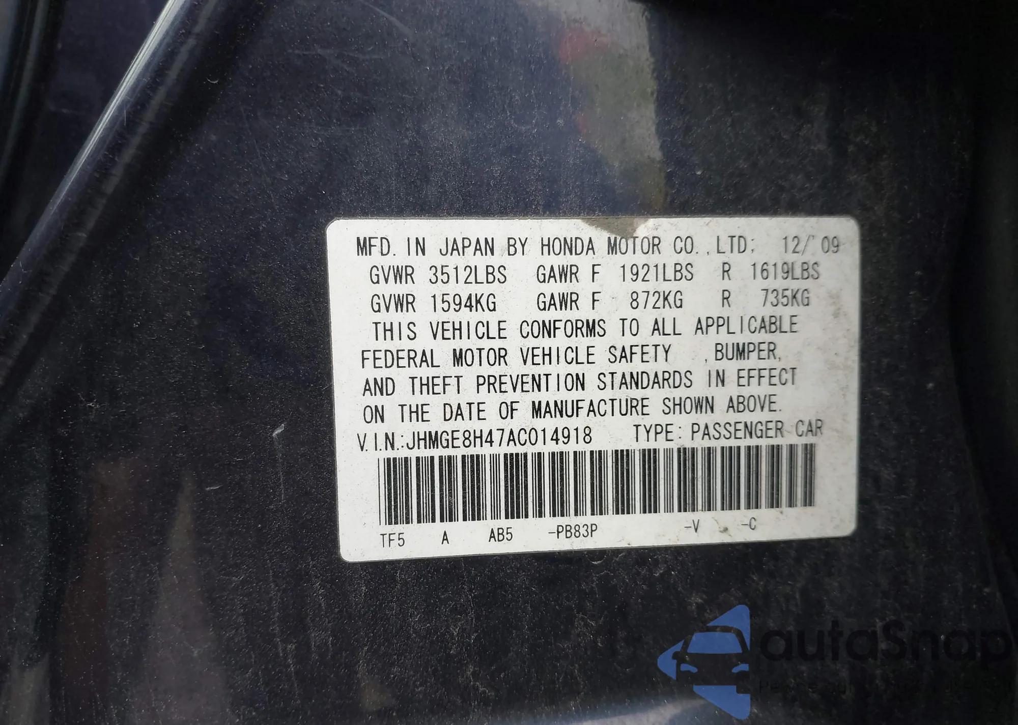 • VIN JHMGE8H47AC014918