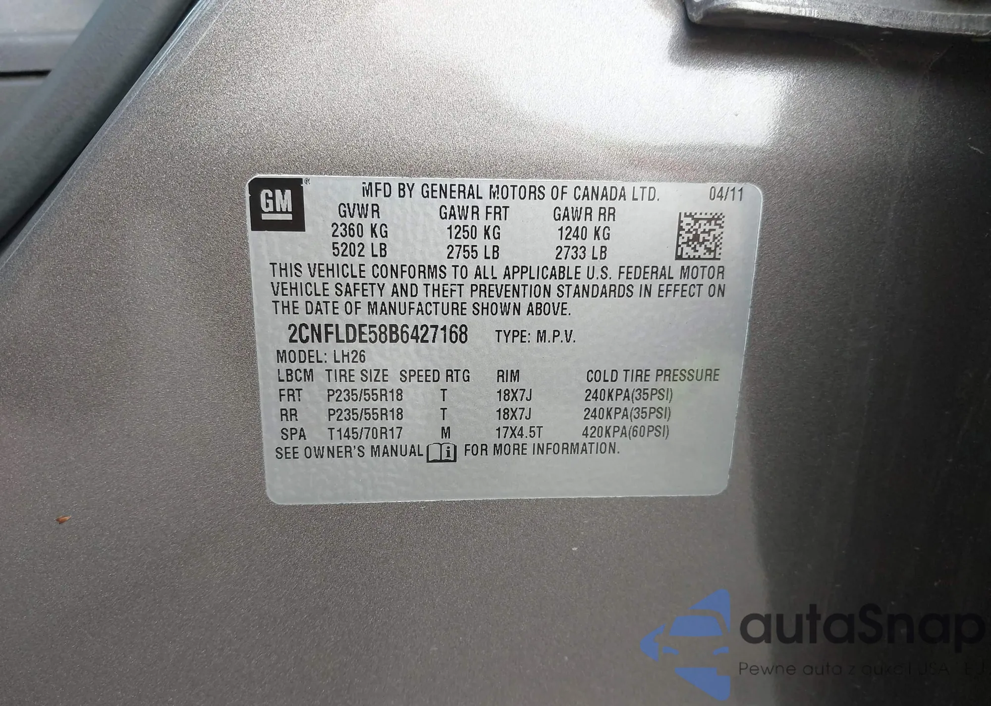 LOT: 42777823 VIN: 2CNFLDE58B6427168