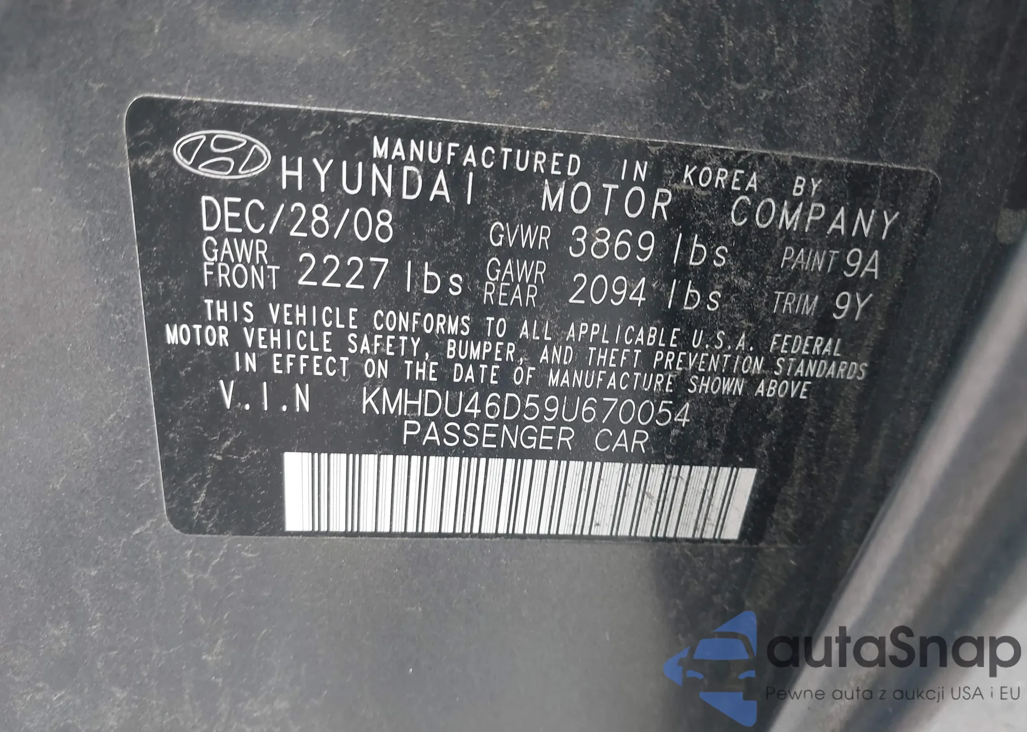 LOT: 43057799 VIN: KMHDU46D59U670054