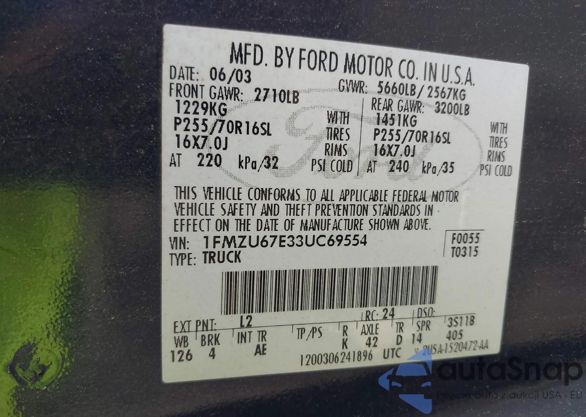 • VIN 1FMZU67E33UC69554