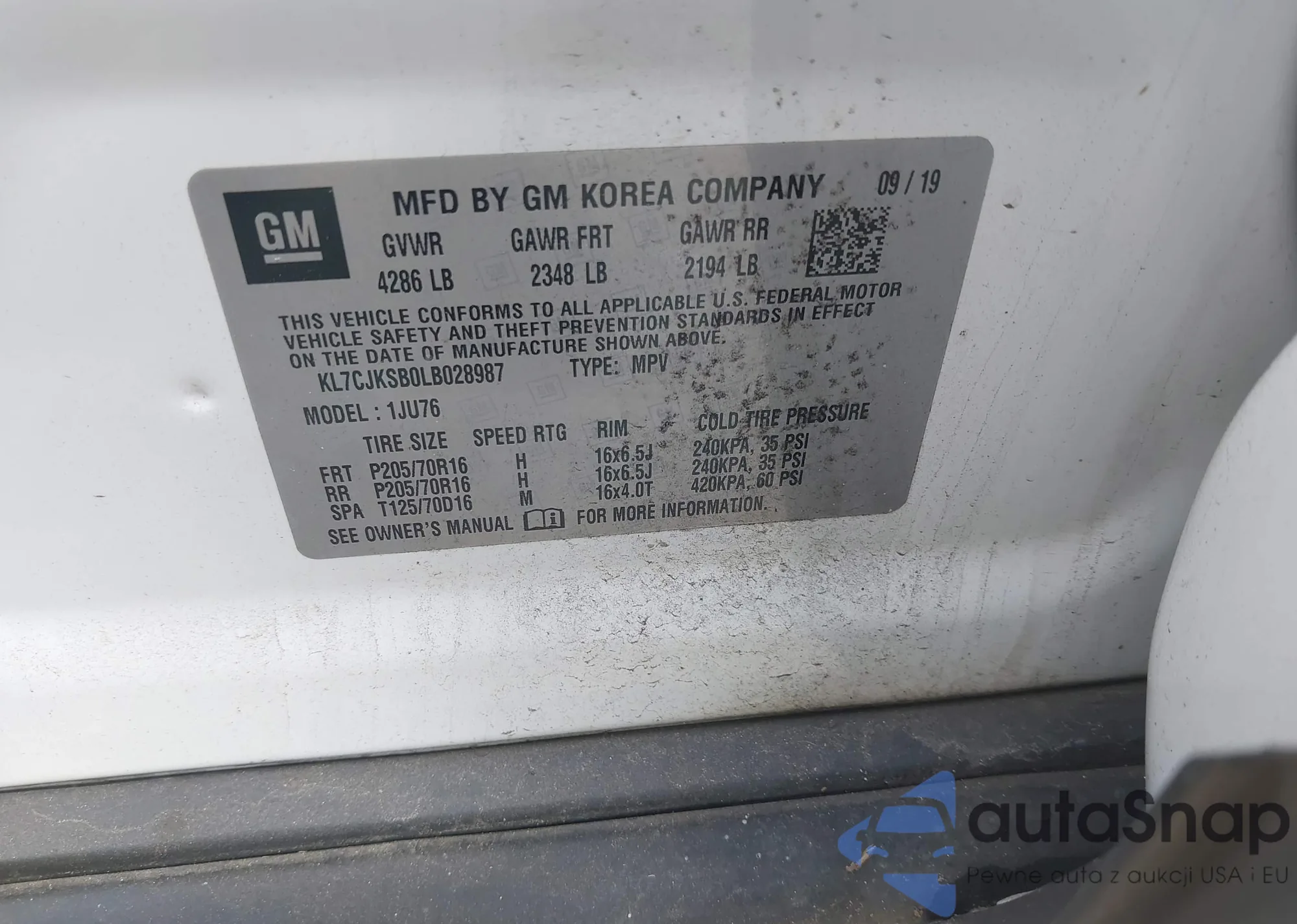 LOT: 42317102 VIN: KL7CJKSB0LB028987
