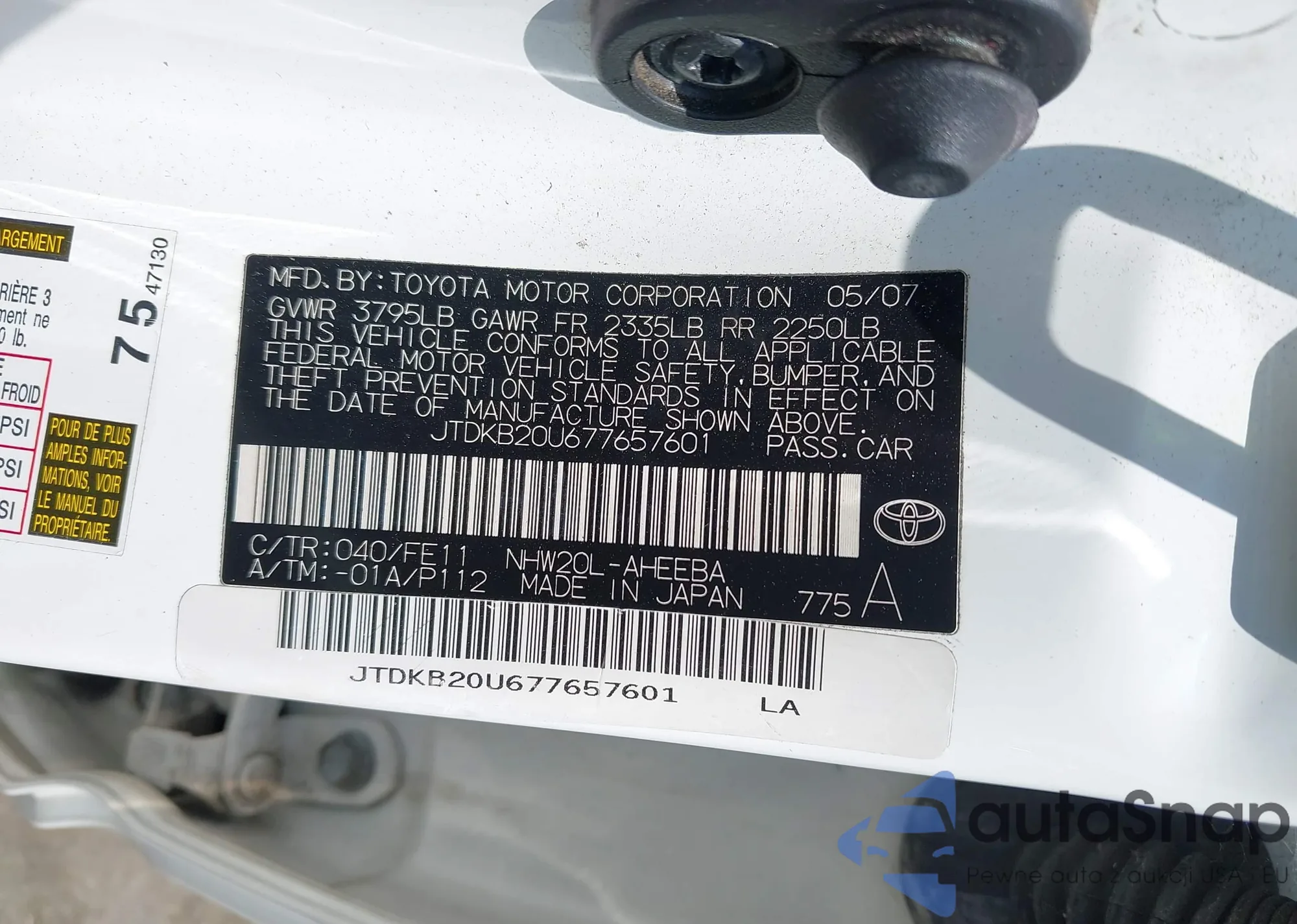 LOT: 42909779 VIN: JTDKB20U677657601
