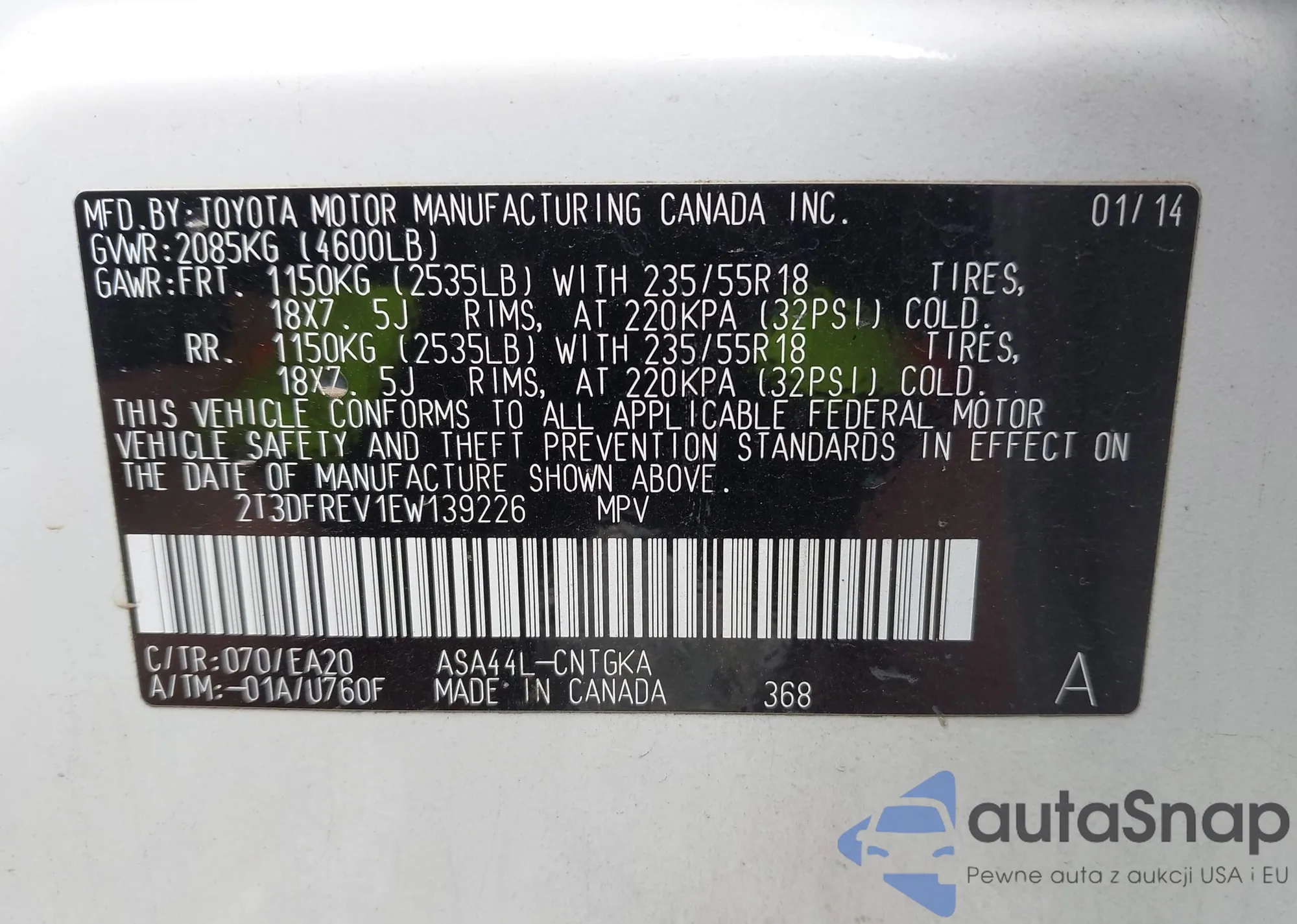 LOT: 42644416 VIN: 2T3DFREV1EW139226