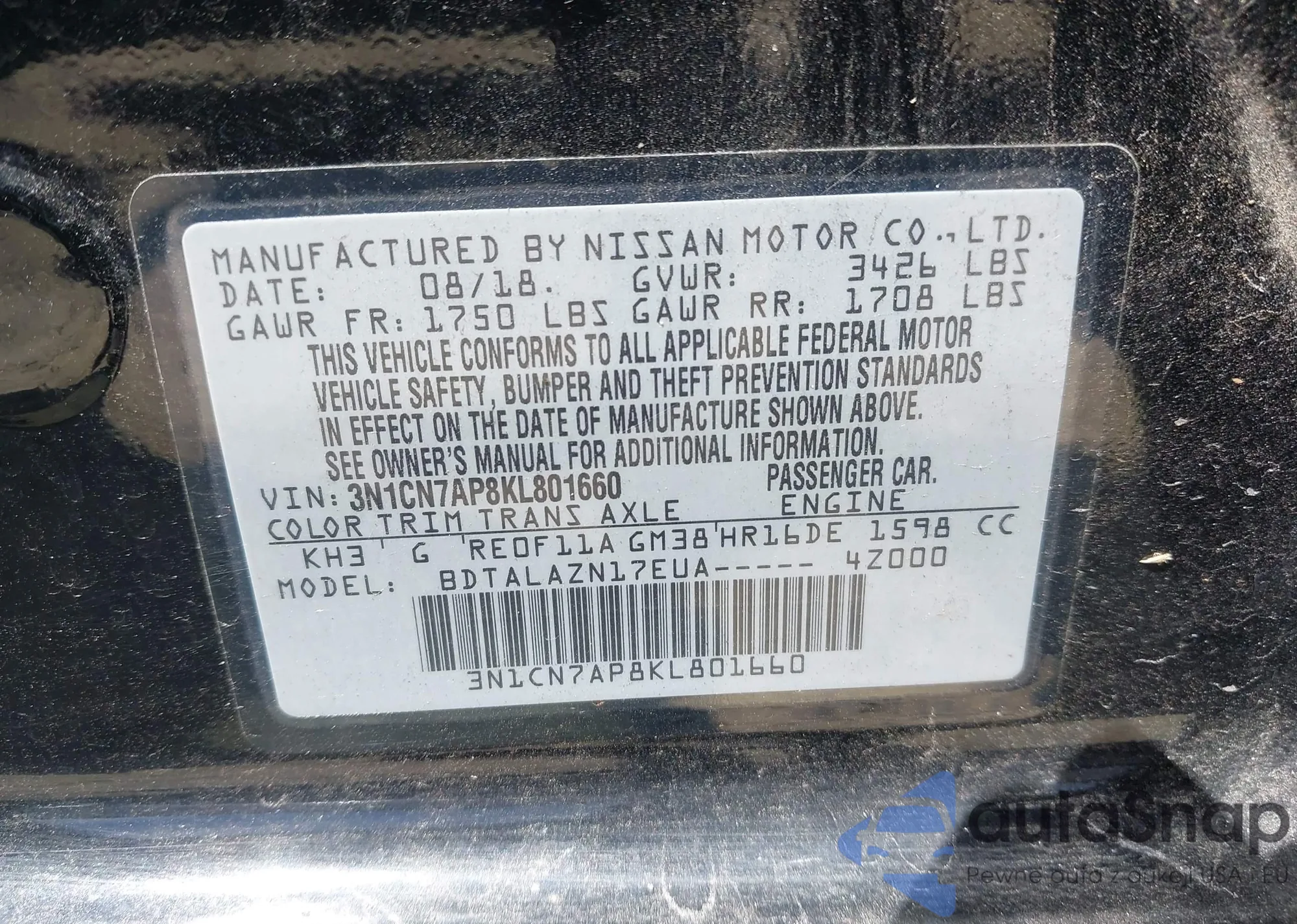 • VIN 3N1CN7AP8KL801660