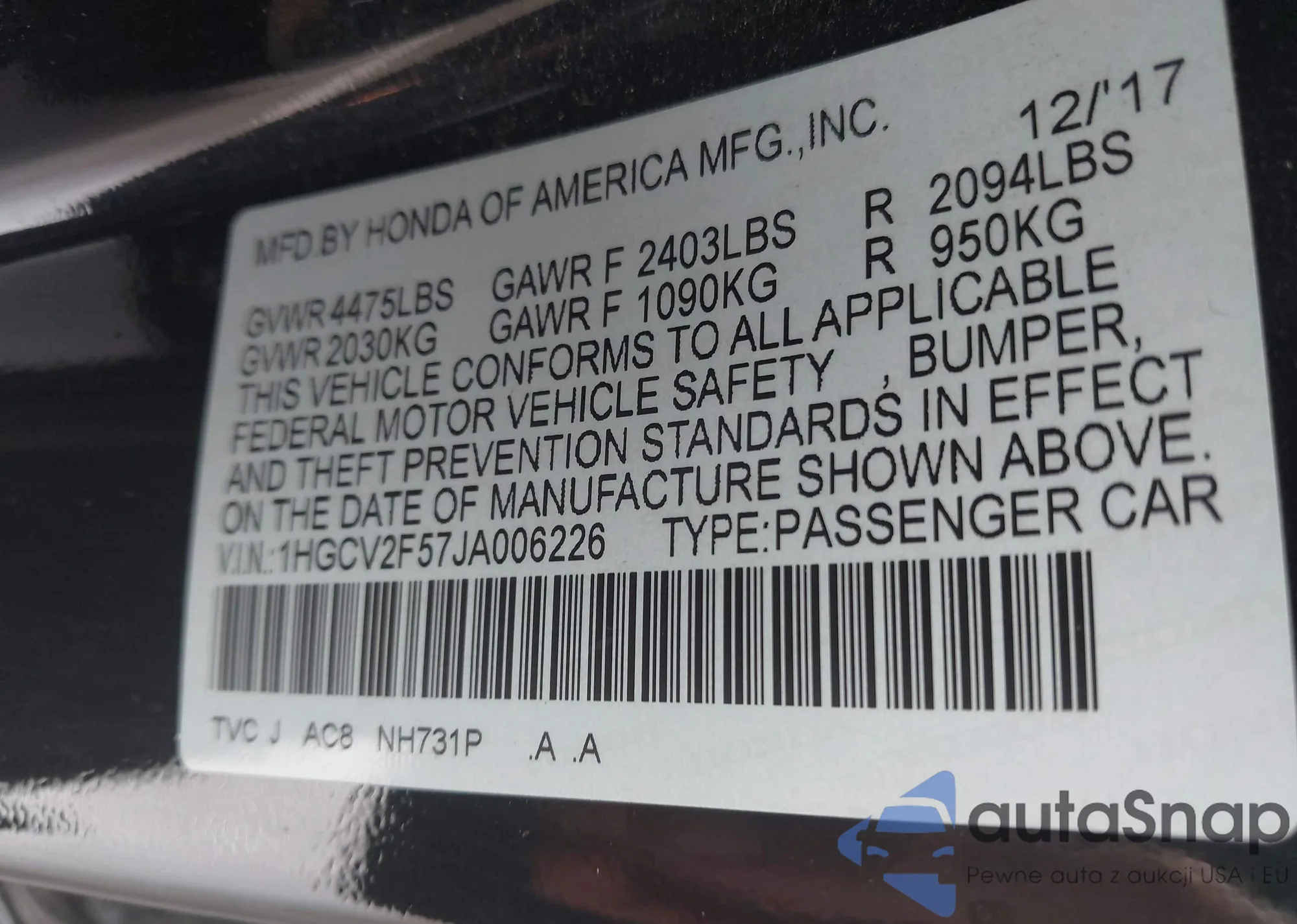 LOT: 42746735 VIN: 1HGCV2F57JA006226